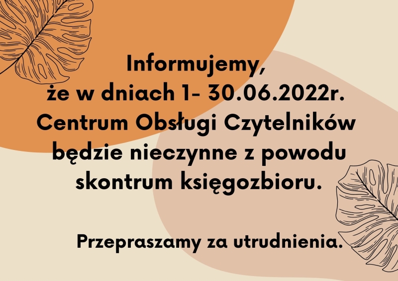 Miejska Biblioteka Publiczna w Siedlcach informuje, że w dniach 1 – 30 czerwca Centrum Obsługi Czytelnika tj. wypożyczalnia książek dla dorosłych będzie zamknięta z powodu skontrum księgozbioru. Przeprowadzenie skontrum jest działaniem obowiązkowym i nie pozwala na jednoczesną obsługę czytelników.