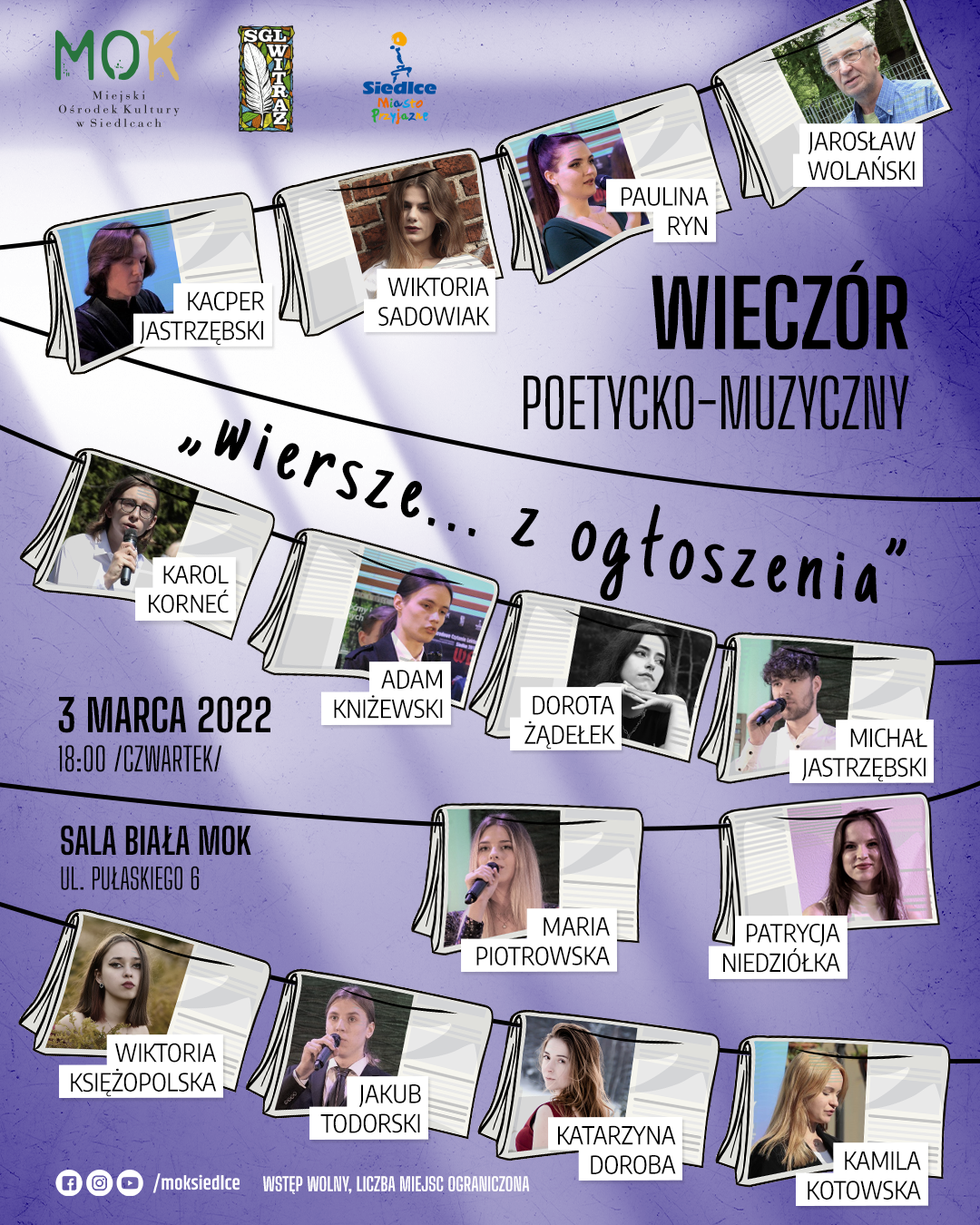 3 marca o godz. 18:00 w Sali Białej Miejskiego Ośrodka Kultury w Siedlcach odbędzie się wieczór poetycko-muzyczny Siedleckiej Grupy Literackiej „Witraż”.