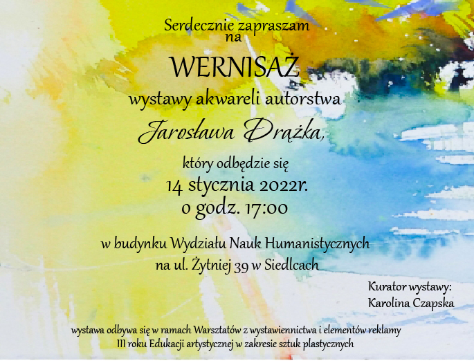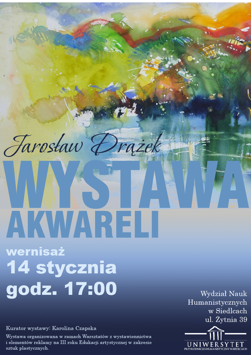 Wystawa akwareli Jarosława Drążka, zostanie otwarta 14 stycznia w budynku Wydziału Nauk Humanistycznych UPH w Siedlcach. Wydarzenie organizowane jest w ramach Warsztatów z wystawiennictwa i elementów reklamy na III roku Edukacji artystycznej w zakresie sztuk plastycznych pod opieką dr. Marcina Sutryka. Początek o godzinie 17:00.