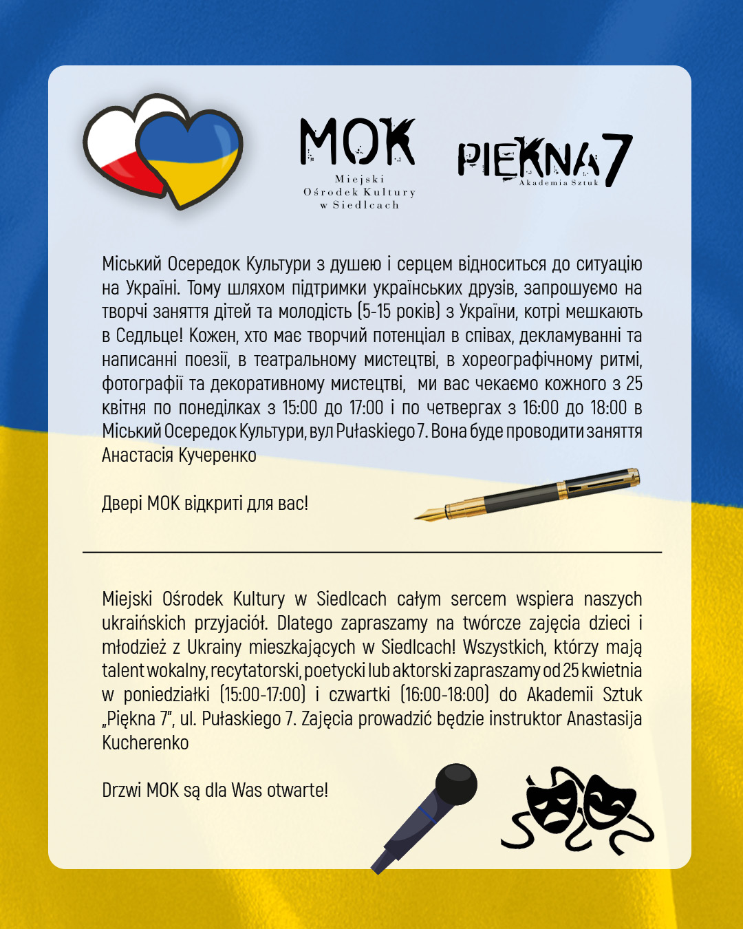 Miejski Ośrodek Kultury w Siedlcach całym sercem wspiera naszych ukraińskich przyjaciół. Dlatego zapraszamy na twórcze zajęcia dzieci i młodzież z Ukrainy mieszkających w Siedlcach! Wszystkich, którzy mają talent wokalny, recytatorski, poetycki lub aktorski zapraszamy od 25 kwietnia w poniedziałki (15:00-17:00) i czwartki (16:00-18:00) do Akademii Sztuk „Piękna 7”, ul. Pułaskiego 7. Zajęcia prowadzić będzie instruktor Anastasija Kucherenko