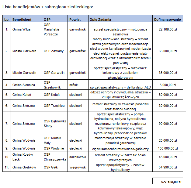 Wsparcie samorządu Mazowsza w wysokości 527 tys. zł trafi do 11 jednostek OSP z regionu siedleckiego. Dzięki pomocy przeprowadzone zostaną remonty strażnic w zakresie m.in. modernizacji posadzki, dachu czy stolarki okiennej. Do strażaków ochotników trafią także motopompy, rozpieracze, defibrylatory, pompy i nożyce hydrauliczne czy samochód ratowniczo-gaśniczy.