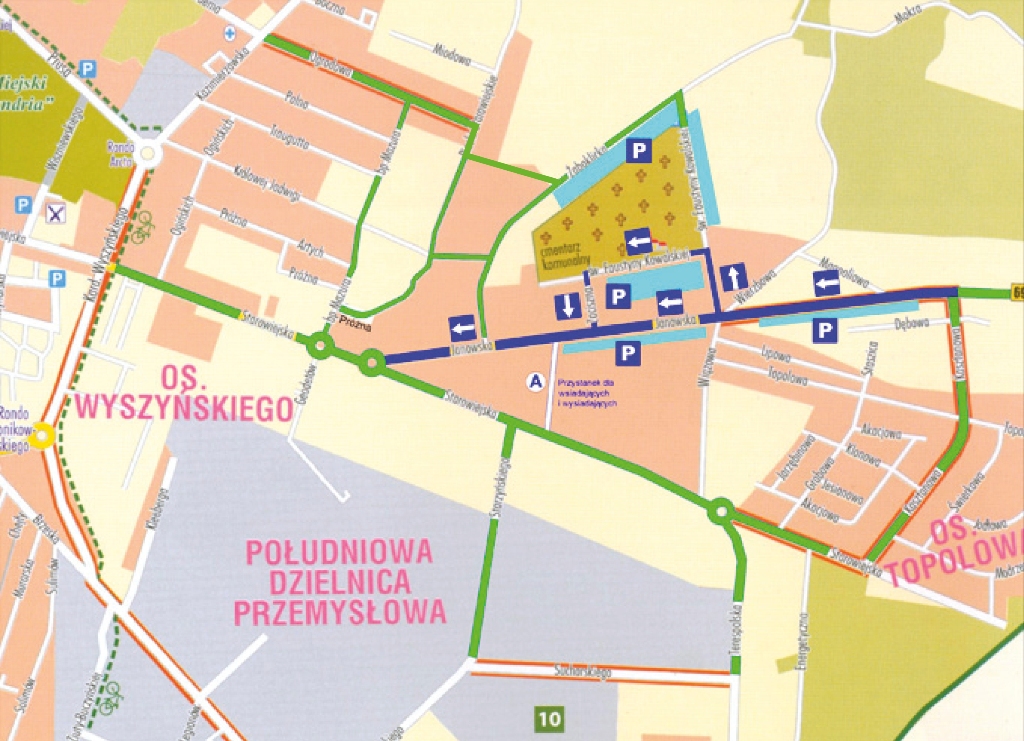Dojazd do cmentarza centralnego będzie odbywał się podobnie, jak w latach poprzednich. Na ulicach dojazdowych zostanie wprowadzony ruch jednokierunkowy, który zapewni sprawny przejazd w tej okolicy. Szczegółowe informacje o organizacji ruchu podane zostały na mapach, na których zaznaczono także tymczasowe strzeżone parkingi.