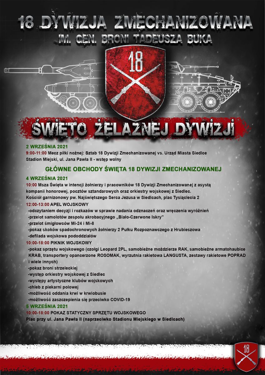 W czwartek na miejskim stadionie reprezentacja wojska rozegra towarzyski mecz z radnymi i urzędnikami siedleckiego magistratu. W sobotę i niedzielę (4-5 września) przez cały dzień będzie można oglądać uzbrojenie i wyposażenie dywizji, wystawione przy ulicy Jana Pawła II, naprzeciwko ośrodka sportowego. Dodatkowo w sobotę w południe odbędzie się tam uroczysty apel, ubogacony przelotami samolotów i śmigłowców oraz skokami spadochronowymi.