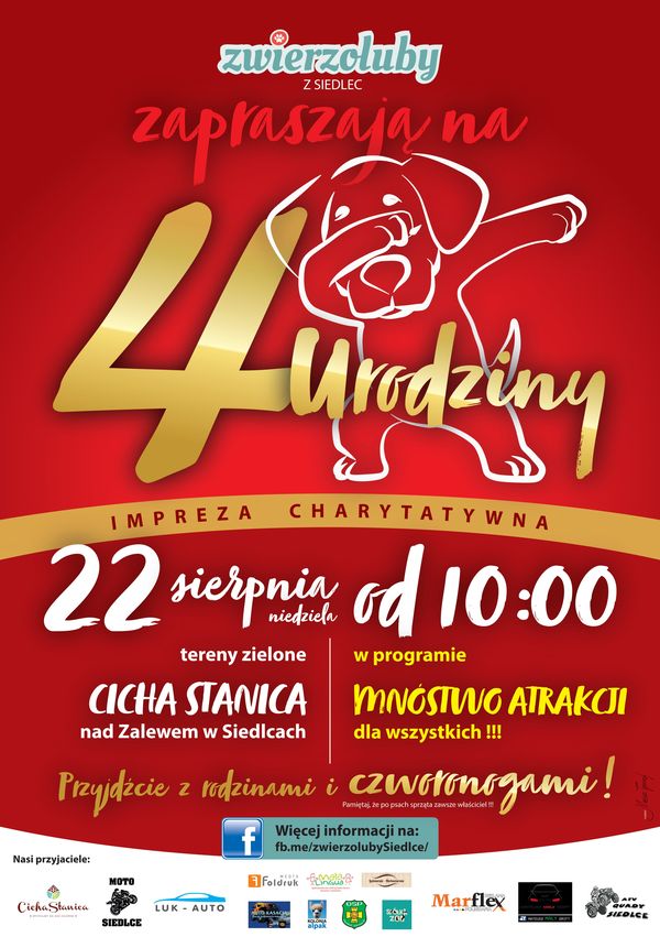 Stowarzyszenia Zwierzoluby z Siedlec obchodzi swoje 4 urodziny. Z tej okazji, 22 sierpnia organizuje spotkanie, na które zaprasza rodziny ze swoimi czworonogami.