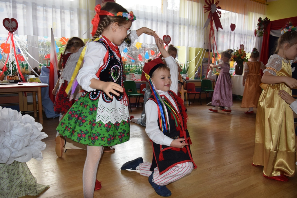 Zwieńczeniem akademii było wspólne odśpiewanie hymnu Polski przez rodziców, dzieci i nauczycielki. Na koniec mali artyści otrzymali słodkie upominki. Dzieci do występu przygotowały panie Jolanta Prokopiuk i Anna Karpińska.