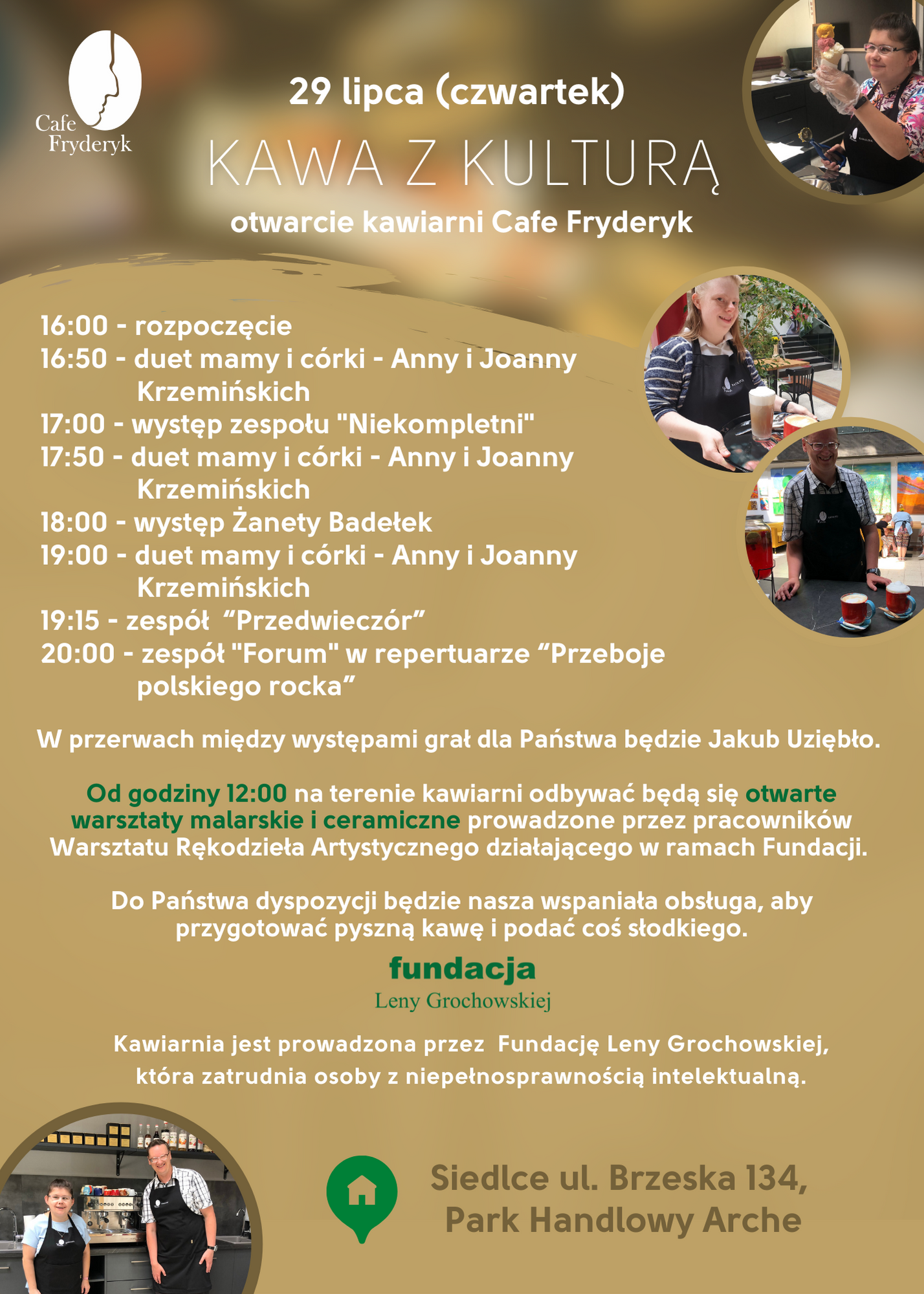 Cafe Fryderyk to nowa inicjatywa Fundacji Leny Grochowskiej, która od kilku lat nie ustaje w staraniach mających na celu aktywizację osób z niepełnosprawnością, również intelektualną oraz wspiera ich pełnoprawne funkcjonowanie społeczne. Dzięki działaniom Fundacji już ponad trzydzieści osób znalazło zatrudnienie, a marka „toMY”, którą sygnowane są powstające w pracowniach Fundacji unikatowe produkty i przedmioty rękodzieła artystycznego zdobywa uznanie koneserów, użytkowników i liczne nagrody.
