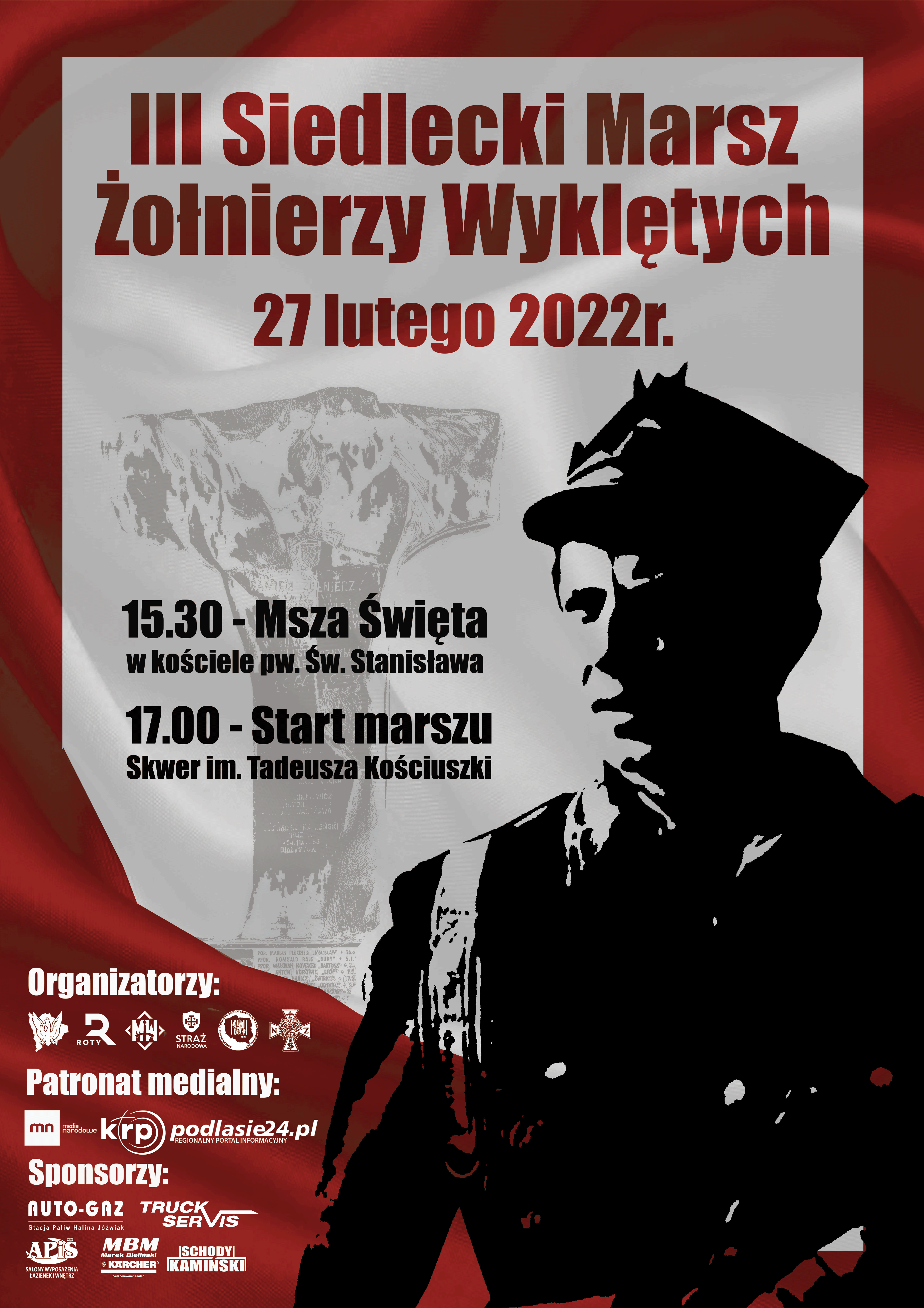 - Narodowy Dzień Pamięci Żołnierzy Wyklętych to jedno z ważniejszych wydarzeń patriotycznych w Polsce  - piszą organizatorzy.  Oprócz tradycyjnego Marszu w Warszawie, nasze Stowarzyszenie współorganizuje wydarzenia w innych regionach Polski. 27 lutego serdecznie zapraszamy na uroczysty przemarsz ulicami Siedlec w hołdzie Żołnierzom Podziemia Niepodległościowego. O godzinie 17:00 ze skweru im. Tadeusza Kościuszki wyruszy III Siedlecki Marsz Żołnierzy Wyklętych organizowany przez Stowarzyszenie Patriotyczne Siedlce oraz inne patriotyczne organizacje, w tym przez Roty Marszu Niepodległości.