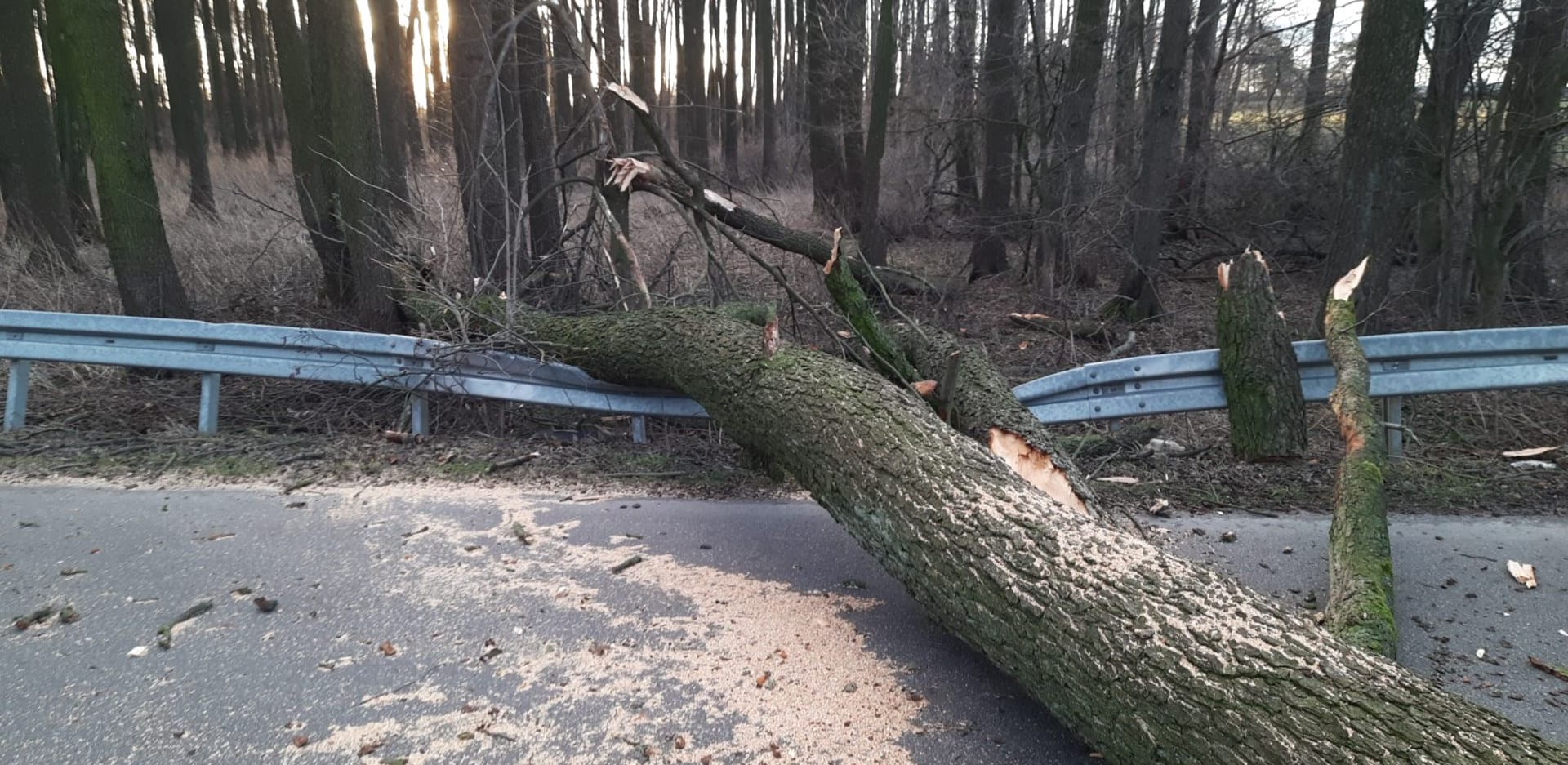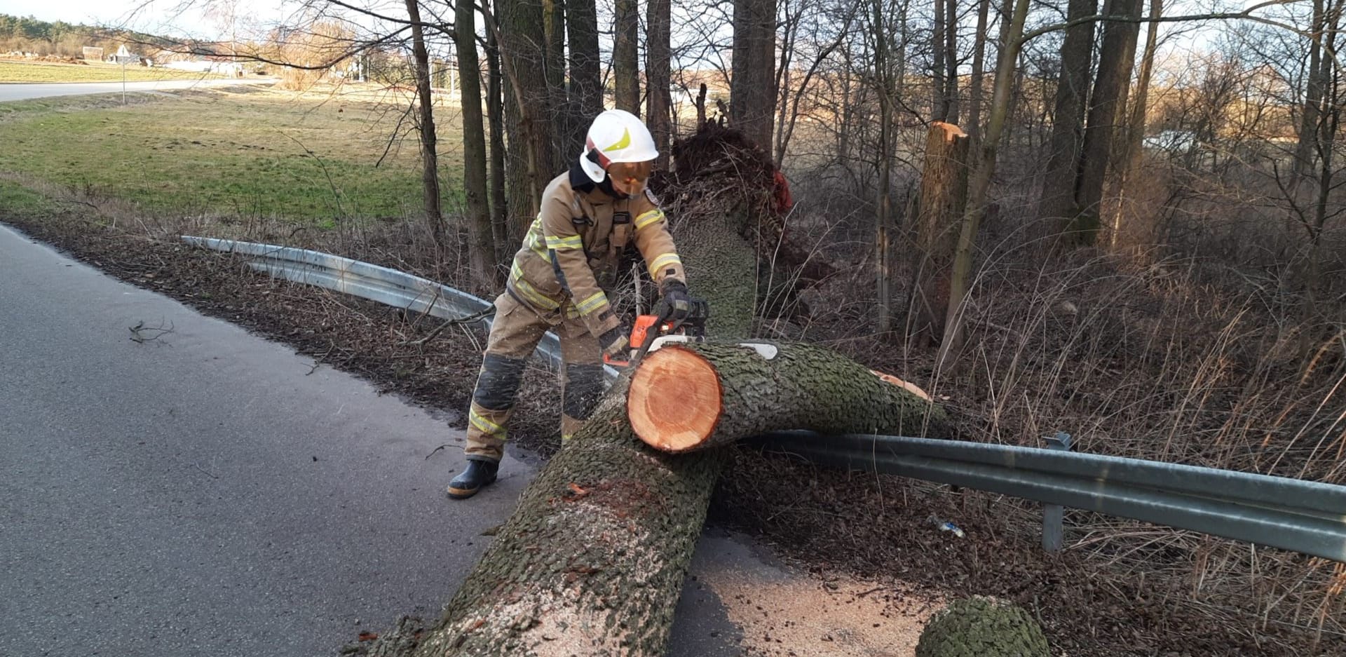 Wiatr nie ustaje, więc całym regionie od rana strażacy są w pełnej gotowości. M.in.: o godzinie 6:58 druhowie z OSP Suchożebry zostali zadysponowani zadysponowani do usunięcia powalonego drzewa, między Podnieśnem a Sosną Korabie. Drzewo całkowicie blokowało drogę, oraz uszkodziło drogową infrastrukturę. Po około godzinie działań strażacy wrócili do jednostki.