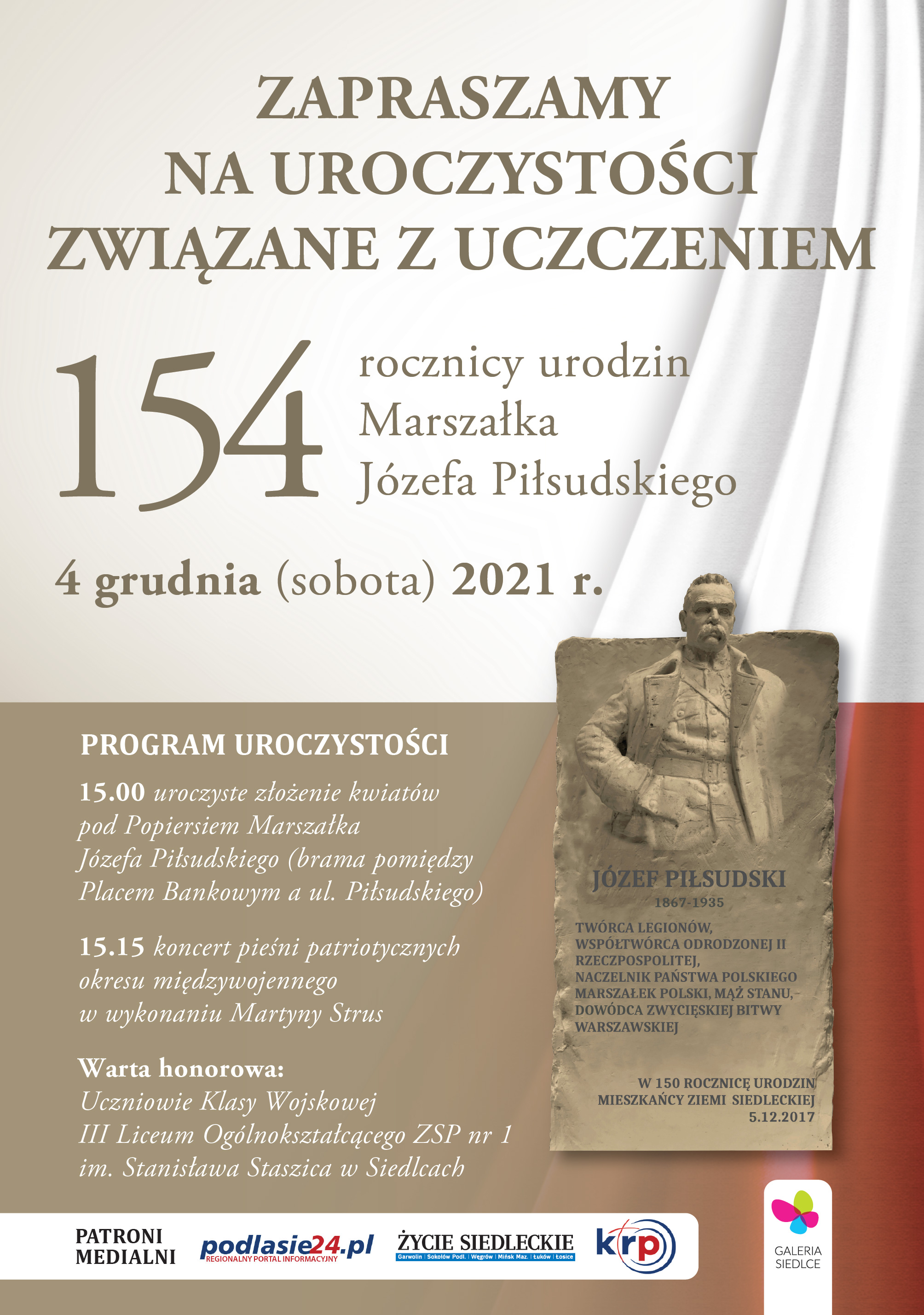 W sobotę, 4 grudnia w Siedlcach będą miały miejsce uroczystości związane z obchodami 154. rocznicy urodzin Marszałka Józefa Piłsudskiego.