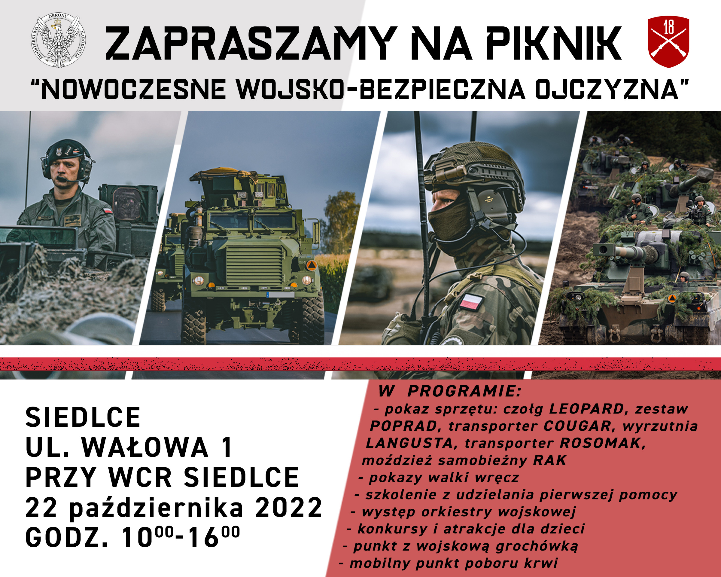 Dla zainteresowanych wojskowi medycy będą organizowali szkolenie z zakresu pierwszej pomocy przedmedycznej. W programie pikniku znajdzie się również pokaz walki wręcz. Dla najmłodszych zaplanowano mnóstwo atrakcji m.in.: tor przeszkód przygotowany przez Centralny Wojskowy Zespół Sportowy. Na tych, którzy będą chcieli podzielić się bezcennym darem życia jakim jest krew, będzie czekał krwiobus. Obecność na pikniku to również szansa na spotkanie i rozmowa z żołnierzami o służbie wojskowej. W mobilnym punkcie rekrutacyjnym specjaliści przekażą wszystkie niezbędne informacje, co zrobić, aby zostać żołnierzem Wojska Polskiego.