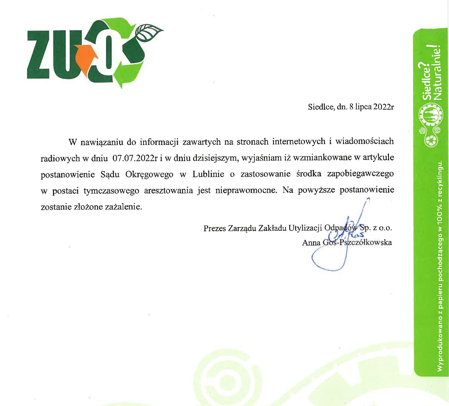 Do naszej redakcji trafiło oświadczenie prezes Zakładu Utylizacji Odpadów w Siedlcach. Prezes zaznaczyła w piśmie, że wyrok sądu dotyczący jej tymczasowego aresztowania jest nieprawomocny i będzie w tej sprawie składała zażalenie.