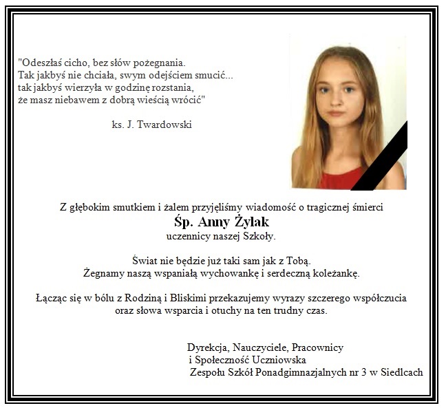Kondolencje z powodu śmierci 16-latki złożyła społeczność Zespołu Szkół nr 3 w Siedlcach, do którego uczęszczała śp. Anna.