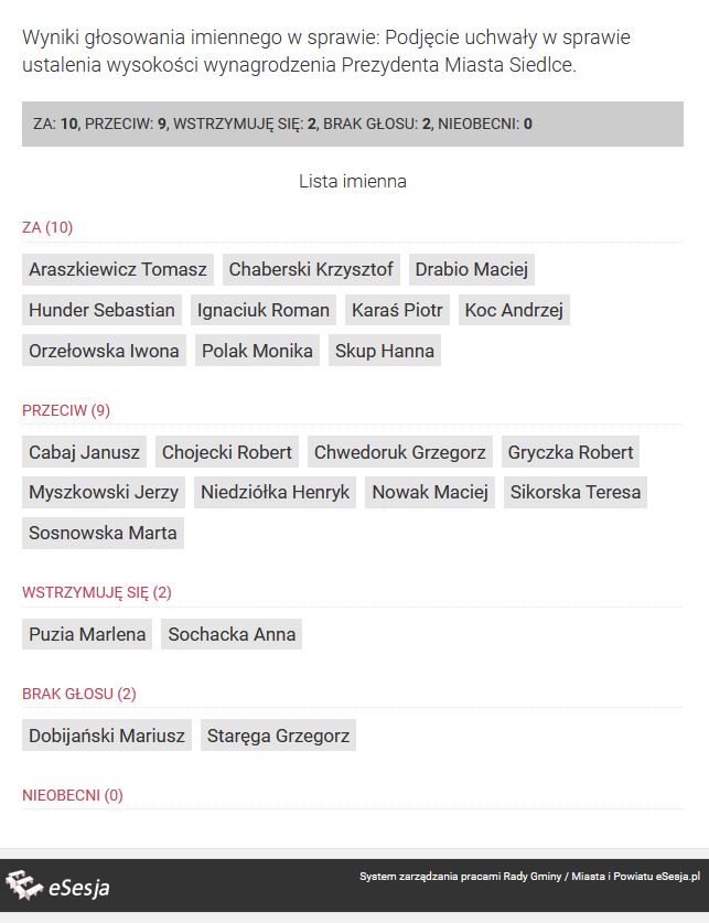 Panie Redaktorze dziękuję bardzo za imienne głosowanie ..To bardzo ważna informacja dla mieszkańców Siedlec. Do Pana piszącego pod pseudonimem Jordz. Ustawa jest rządowa ale przewiduje tzw "widełki" nie narzuca z automatu maksymalnej stawki. radni mogli zaproponować minimalną stawkę podwyżki lub inną. Proszę nie wprowadzać ludzi w błąd. Podwyżka pensji dla Prezydenta była inicjatywą grupy radnych kto to byłe tez można sprawdzić bo to publiczne dane a maksymalną podwyżkę przegłosowali wyżej wymienienie radni . Taka jest prawda czy pan chce czy nie.