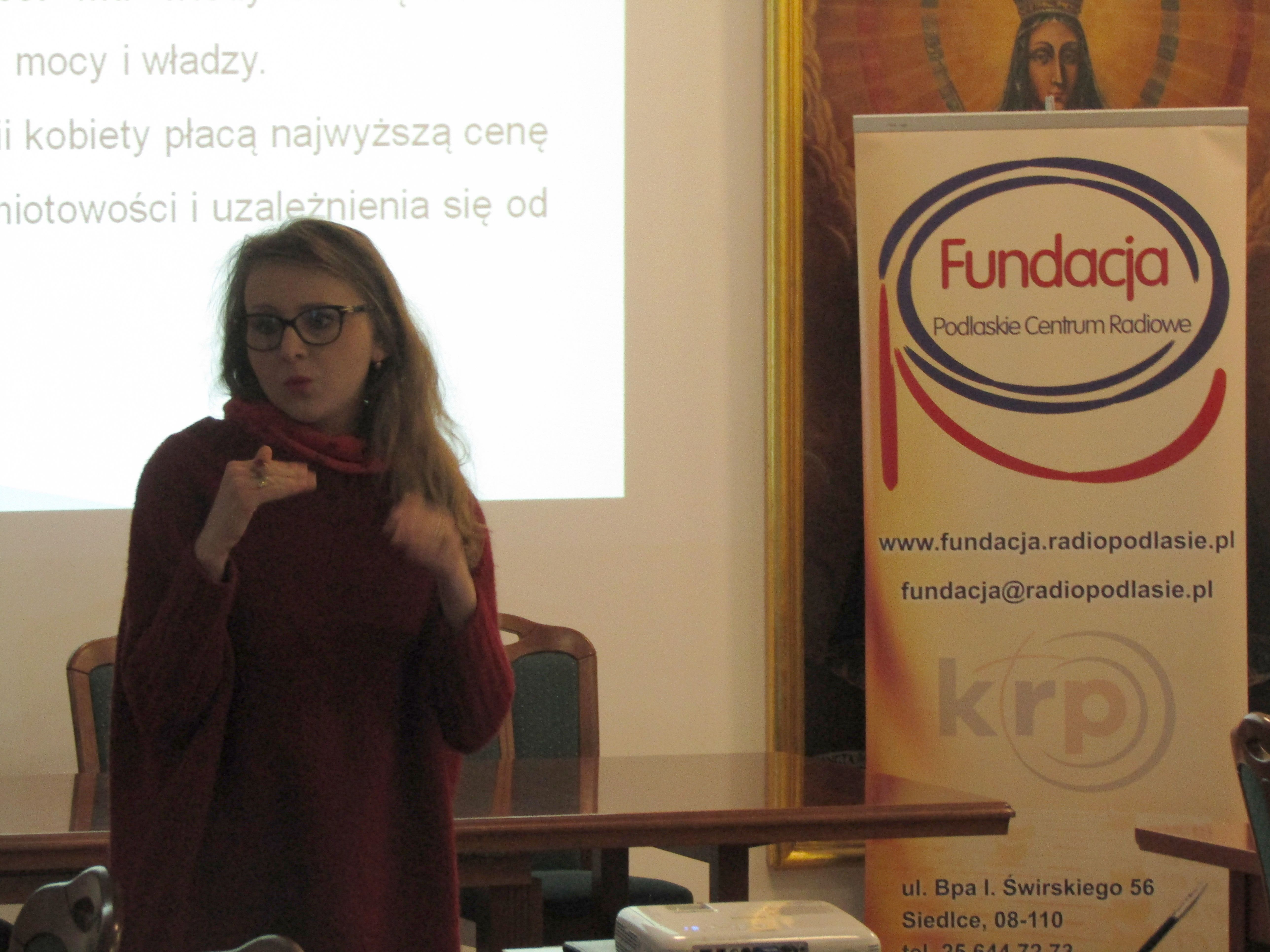 Drugą prelegentką była starsza psycholog Zakładu Karnego w Siedlcach, Edyta Starostka, która przybliżyła tematykę przyczyn powstawania zachowań przestępczych ze szczególnym uwzględnieniem uzależnień i przemocy. Przedstawiła również sposoby zapobiegania im. Podzieliła się także doświadczeniami wypływającymi z wieloletniej pracy psychologicznej z osadzonymi w siedleckim Zakładzie Karnym.