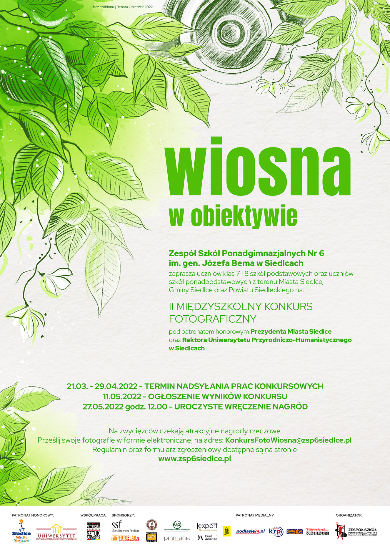 II Międzyszkolny Konkurs Fotograficzny „Wiosna w obiektywie” organizuje Zespół Szkół Ponadgimnazjalnych nr 6 im. gen. Józefa Bema w Siedlcach. Konkurs skierowany jest do uczniów klas 7 i 8 szkół podstawowych i ponadpodstawowych z terenu miasta Siedlce, Gminy Siedlce i Powiatu Siedleckiego. Prace przyjmowane są od 21 marca do 29 kwietnia.