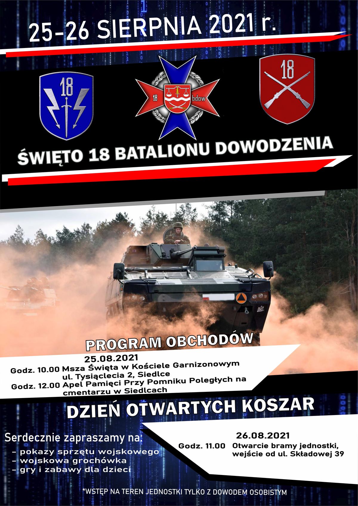 25 sierpnia w Siedlcach odbędą się obchody święta 18 Batalionu Dowodzenia. O godz. 10.00 w Kościele Garnizonowym będzie sprawowana Msza św., a o godz. 12.00 odbędzie się Apel Pamięci przy Pomniku Poległych.