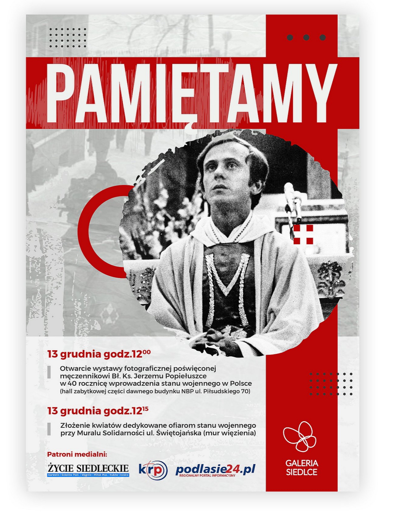 13 grudnia o godz. 12:00 w hali zabytkowej dawnego budynku NBP przy ul. Piłsudskiego 70 w Siedlcach nastąpi otwarcie wystawy fotograficznej poświęconej męczennikowi Bł. Ks. Jerzemu Popiełuszce. To wydarzenie przygotowane z okazji 40. rocznicy wprowadzenia stanu wojennego w Polsce.