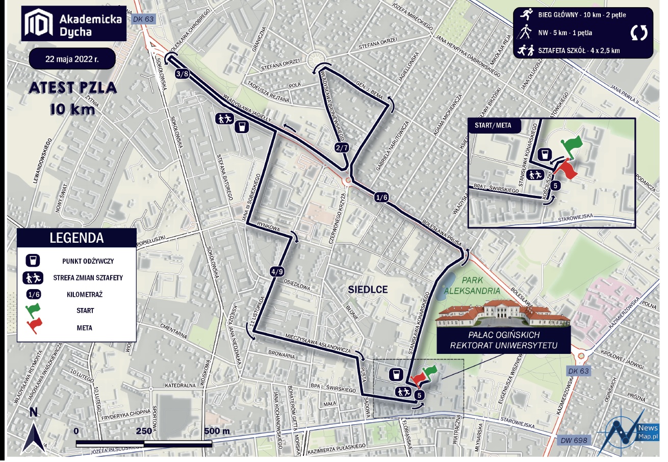 Zaplanowano bieg główny na 10 km, Marsz Nordic Walking na 5 km oraz sztafetę dla szkół średnich 4x2,5 km. Start pierwszego biegu zaplanowano o godz. 9:00 przy Rektoracie UPH na ul. Konarskiego 2. Biegacze będą poruszali się ulicami: Konarskiego, Prusa, Jagiellońską, Bema, Broniewskiego, Jagiełły, Jana II Sobieskiego, Rynkową, 11 Listopada, Asłanowicza.