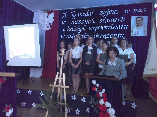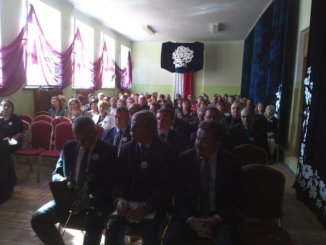 Dalsza część uroczystości odbywa się w szkole. Przewodniczący Rady Gminy Międzyrzec Andrzej Pietruk odsłonił tablicę pamiątkową a proboszcz parafii dokonał  jej poświęcenia.
