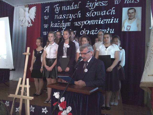 Uchwałę Rady Gminy o nadaniu imienia Janusza Kusocinskiego Szkole Podstawowej i Gimnazjum odczytał Przewodniczący Rady Gminy Międzyrzec Andrzej Pietruk.