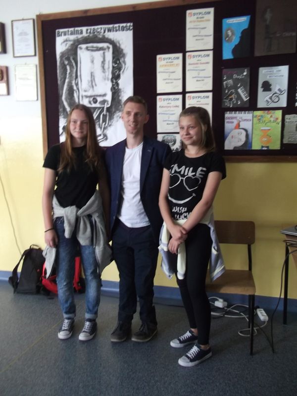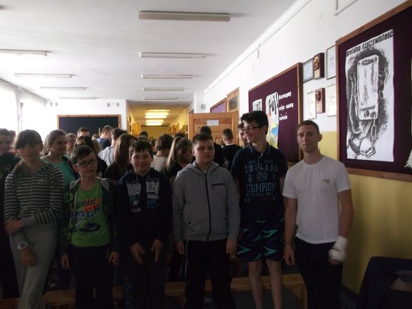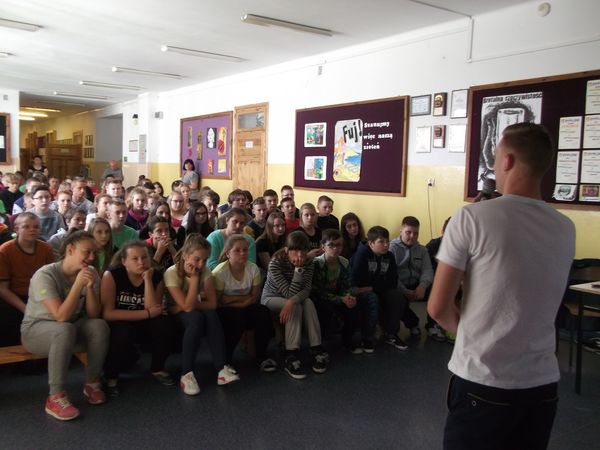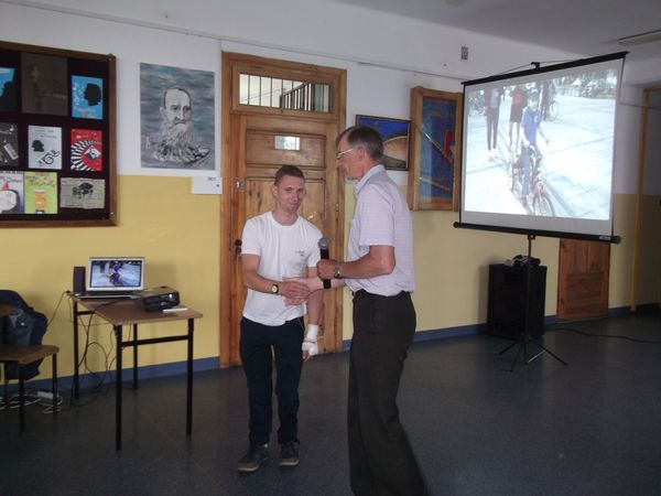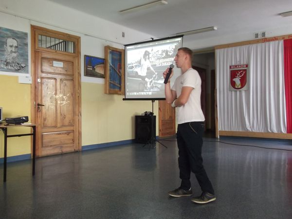 Kamil Misztal na spotkaniu z młodzieżą zaprezentował uczniom film i zdjęcia oraz opowiadał o radościach i trudnościach związanych z jego wyprawą po Polsce, w której zbierał pieniądze dla chorego Oskara. Każdy przejechany kilometr można kupić na stronie http://www.zrzutka.pl/, nie wychodząc z domu.