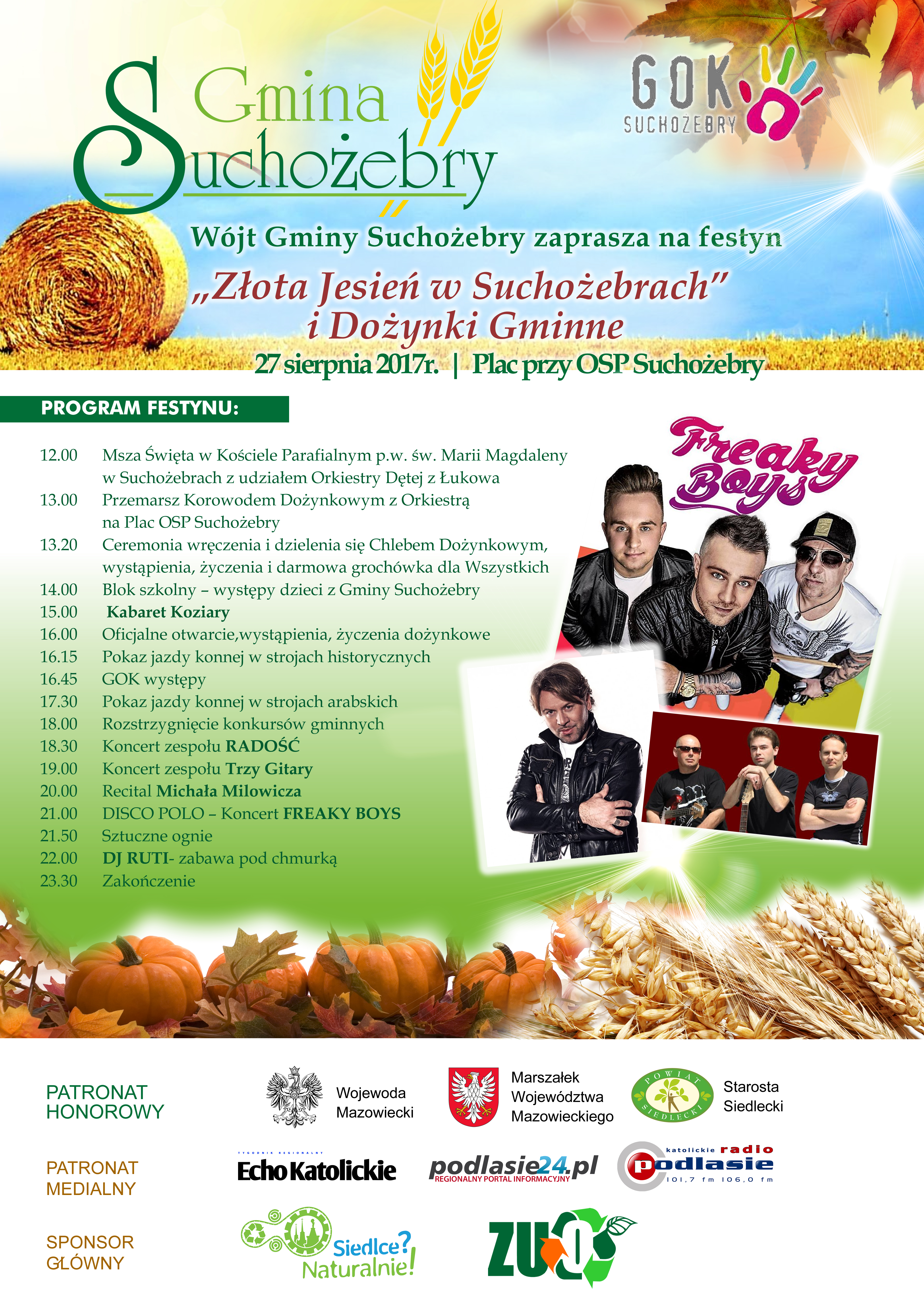Wójt Gminy Suchożebry zaprasza na festyn „Złota Jesień w Suchożebrach i Dożynki Gminne”. Wydarzenie odbędzie się 27 sierpnia, a zainauguruje je Msza św. sprawowana o godzinie 12.00 w kościele parafialnym pw. Marii Magdaleny.