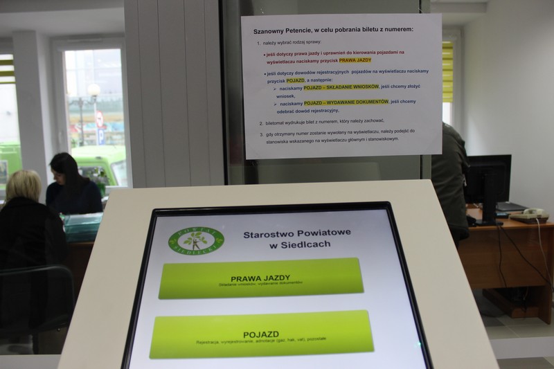 Dziś wszyscy, którzy chcą zarejestrować pojazd, odebrać lub złożyć dokumenty, korzystają z  systemu elektronicznego systemu kolejkowego. „Biletomat” z elektronicznym wyświetlaczem umieszczony został w poczekalni. Dzięki temu możemy na bieżąco obserwować na ekranie liczbę osób oczekujących oraz numer zarezerwowanego stanowiska. Nowością i znacznym ułatwieniem jest również możliwość rezerwacji terminu załatwienia sprawy przez Internet. Specjalna aplikacja dostępne na stronie internetowej powiatu w zakładce „ZAREZERWUJ WIZYTĘ W WYDZIALE KOMUNIKACJI” pozwala na wybór najdogodniejszego terminu ( dnia i godziny), z dwutygodniowym wyprzedzeniem. Wprowadzone zmiany poprawiły funkcjonowanie wydziału, pozwoliły skrócić czas załatwiania urzędowych spraw oraz przede wszystkim podniosły komfort obsługi naszych klientów.