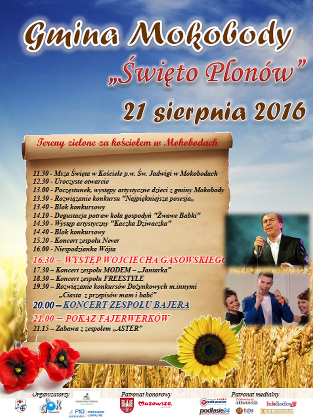 Gmina Mokobody zaprasza 21 sierpnia na coroczne „Święto Plonów”. Uroczystości rozpoczną się od godz. 11.30 Mszą św. w miejscowym kościele.