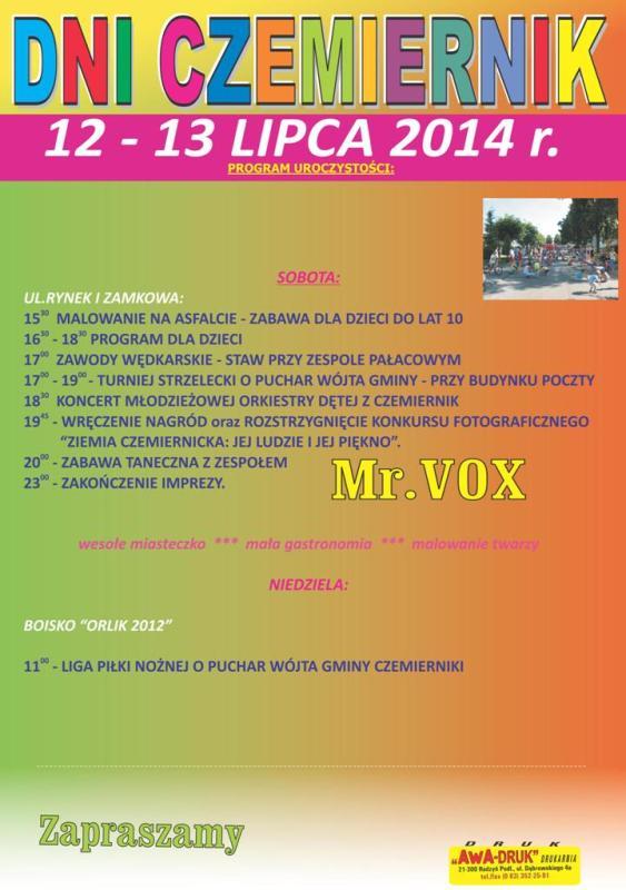 Sobotnie obchody Dni Czemiernik o godz. 15.00 rozpocznie malowanie na asfalcie – zabawa dla dzieci do 10 lat. W dalszej części planowane są zawody wędkarskie, turniej strzelecki o puchar Wójta Gminy Czemierniki, rozstrzygniecie konkursu fotograficznego ,,Ziemia czemiernicka: jej ludzie i jej piękno” oraz zostaną rozdane nagrody dla laureatów. Od godz. 20.00 do 23.00 będzie zabawa taneczna z zespołem Mr. Vox.