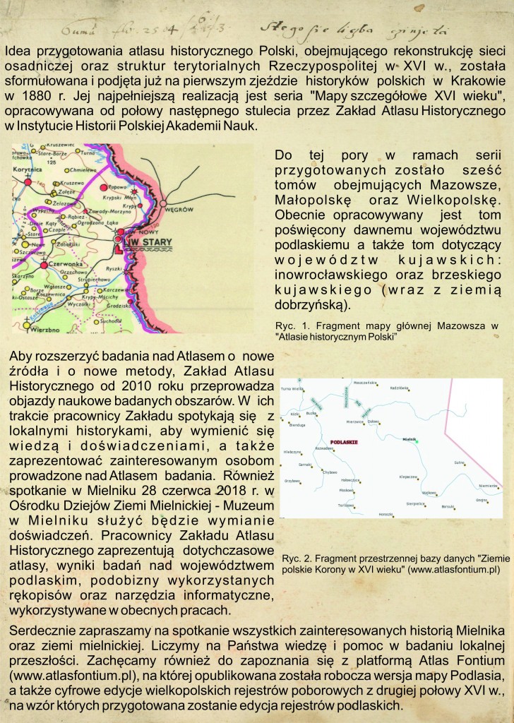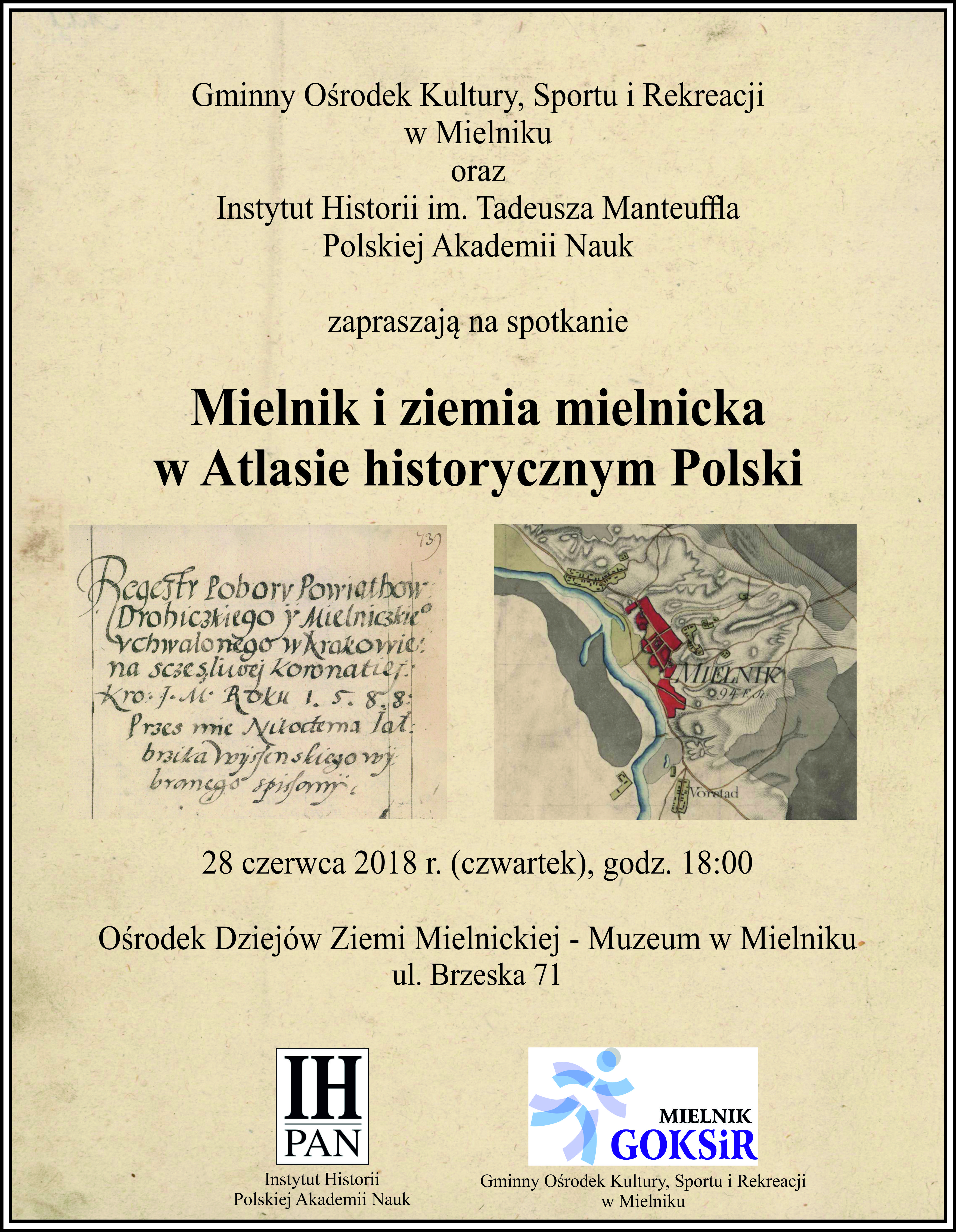 Gminny Ośrodek Kultury, Sportu i Rekreacji w Mielniku oraz Instytut Historii im. Tadeusza Manteuffla Polskiej Akademii Nauk zapraszają na spotkanie pt. „Mielnik i ziemia mielnicka w Atlasie historycznym Polski”.