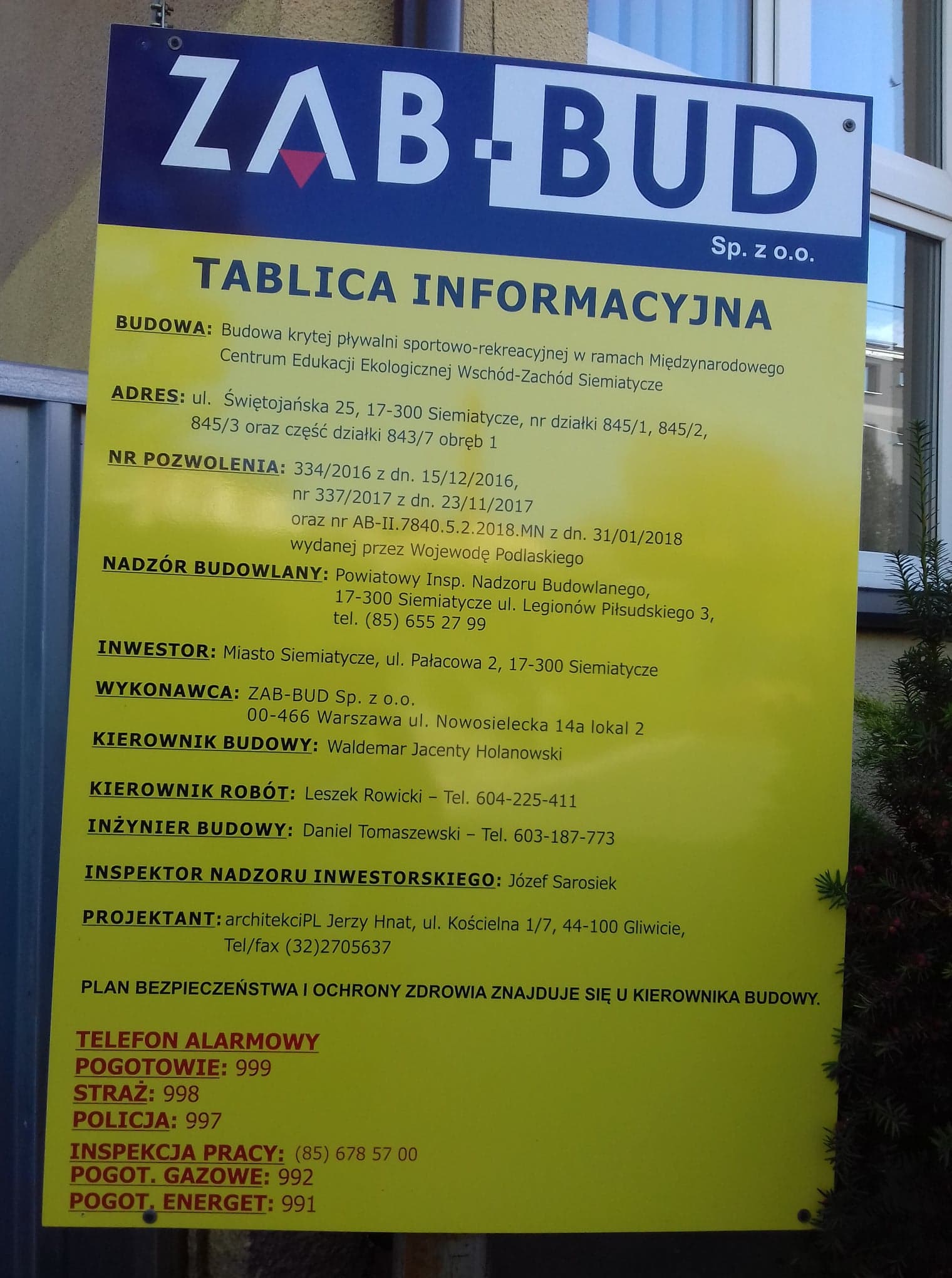 Firmy, która wybuduje basen w Siemiatyczach szukano prawie rok. Pierwszy przetarg na budowę - krytej pływalni sportowo-rekreacyjnej w ramach Międzynarodowego Centrum Edukacji Ekologicznej Wschód-Zachód w Siemiatyczach – ogłoszono w listopadzie 2017 roku. W czwartym przetargu wyłoniono wykonawcę, którym jest ZAB-BUD Sp. z o.o. Warszawska firma zapewnia, że jest otwarta na współpracę z lokalnymi przedsiębiorcami, jako podwykonawcami zadania.
