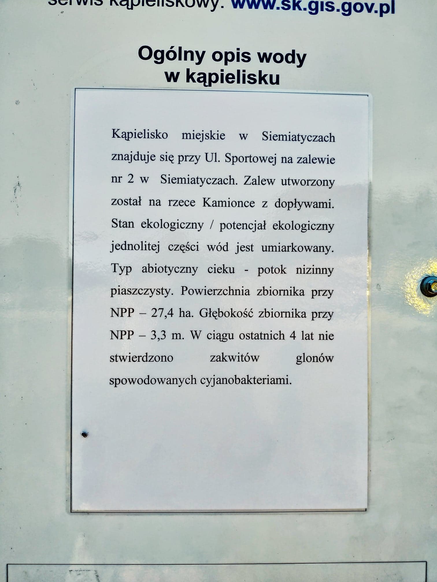 Jedno z dwóch strzeżonych i kąpielisk w powiecie siemiatyckim, gdzie woda jest monitorowana przez Sanepid jest kąpielisko w Siemiatyczach. Strzeżone kąpielisko znajduje się przy ul. Sportowej, czyli na tzw. dużym zalewie. Jest tam plaża miejska i molo, a od wtorku do niedzieli w godz. 11.00 – 18.00 dyżurują ratownicy.