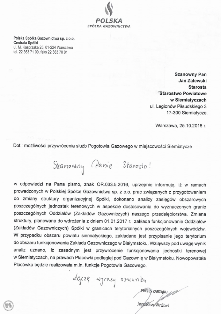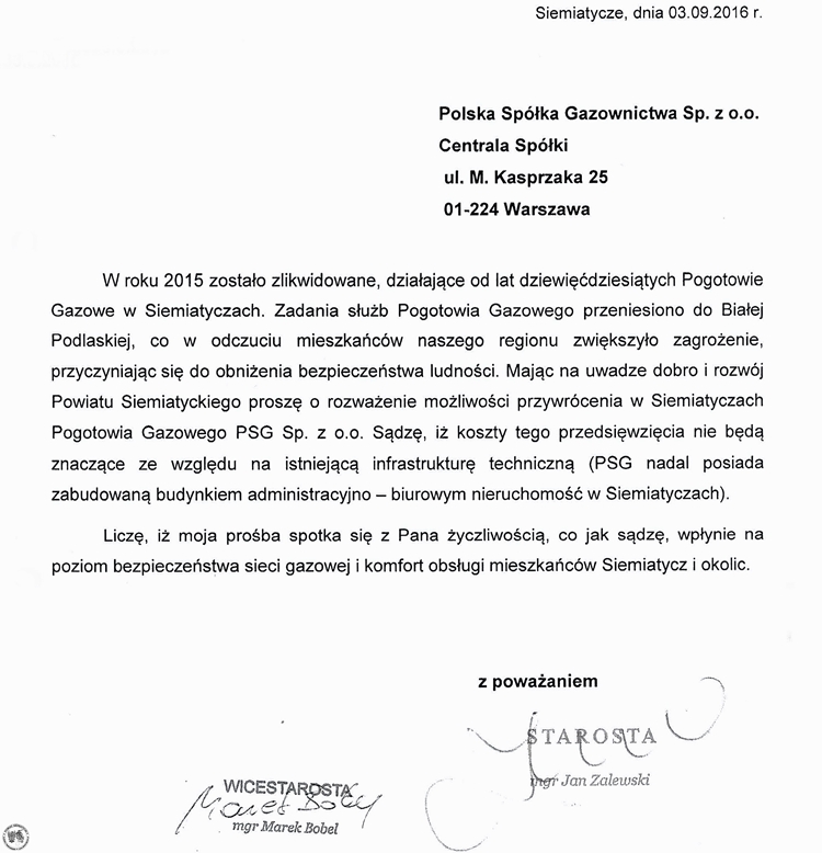 Do Siemiatycz powróci zlikwidowana Placówka Terenowa Polskiej Spółki Gazownictwa. Władze Polskiej Spółki Gazownictwa w Warszawie zdecydowały, że od 1 stycznia 2017 roku do Siemiatycz powróci Placówka Terenowa Polskiej Spółki Gazownictwa, w tym pogotowie gazowe oraz administracja.