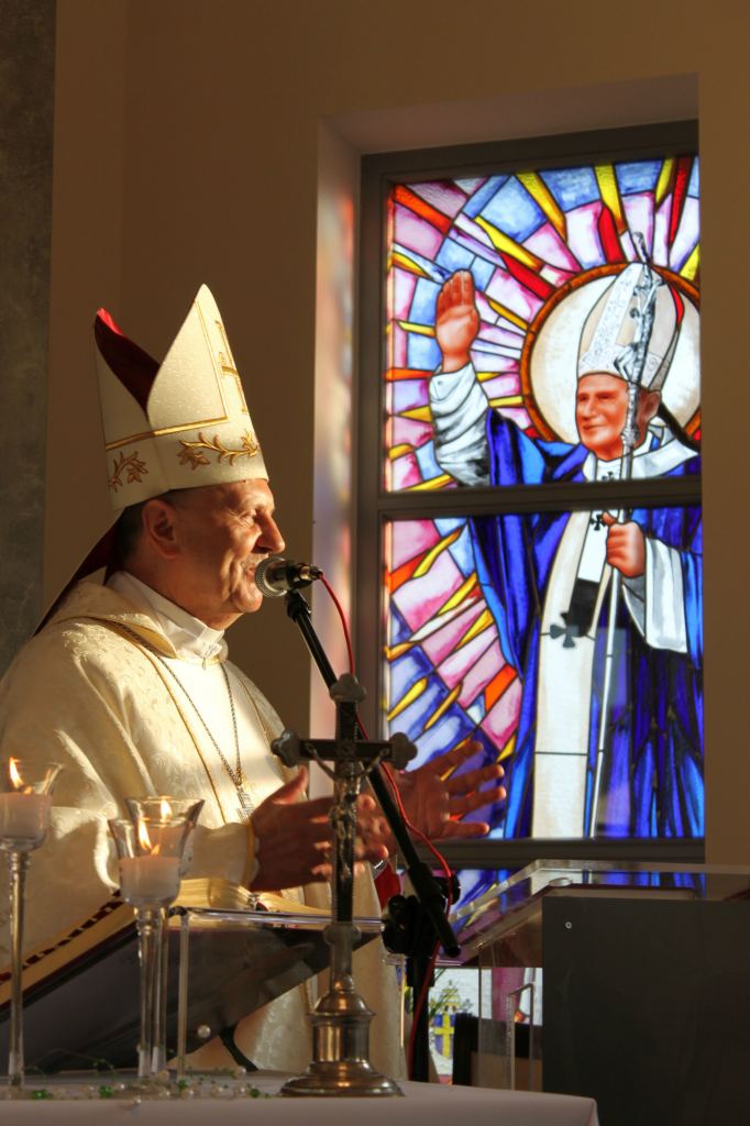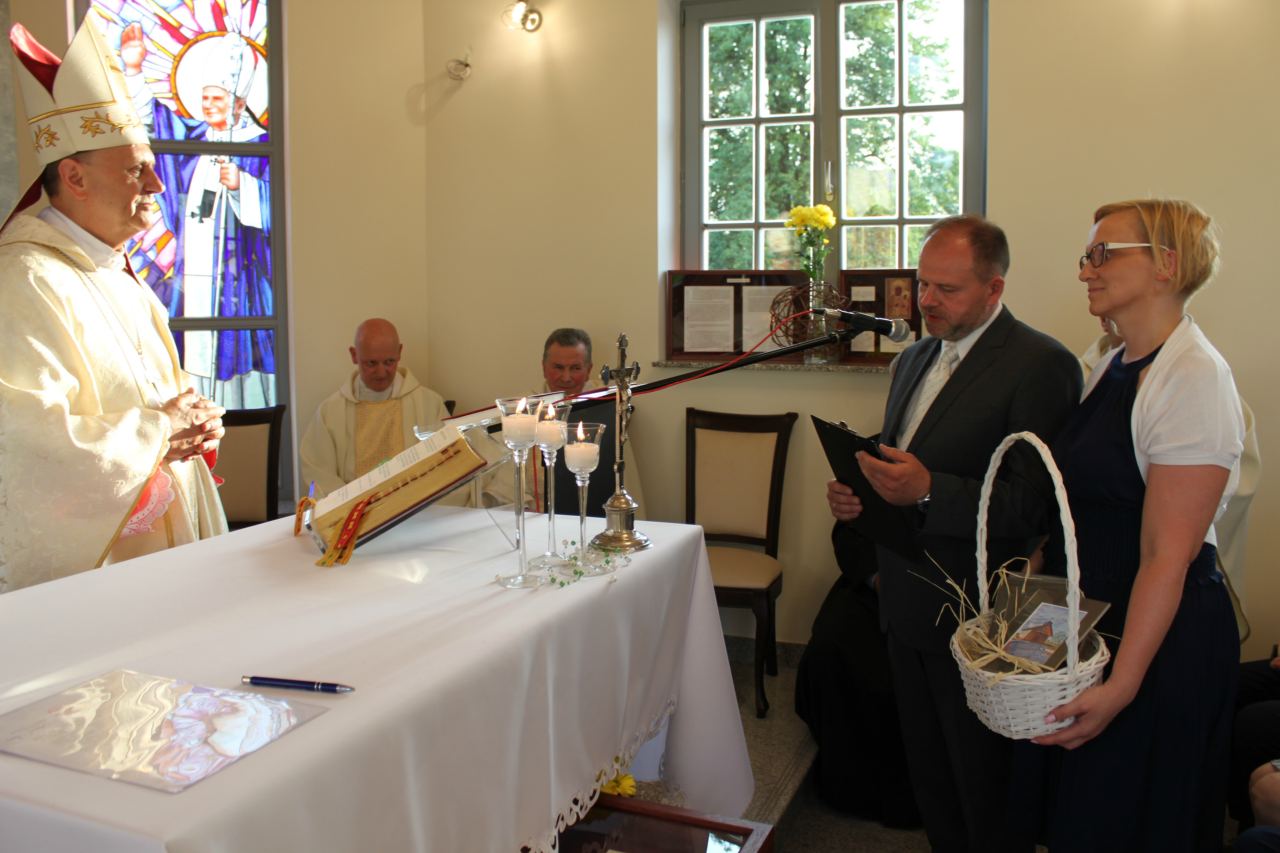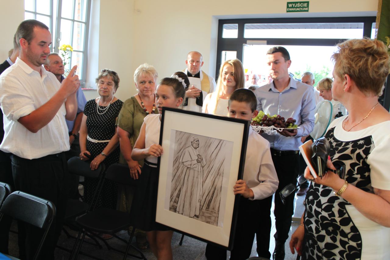 W procesji z darami szły trzy pokolenia mieszkańców miejscowości. W darze przyniesiono m.in. projekt obrazu Jana Pawła II – kopię obrazu z sanktuarium w Łagiewnikach.