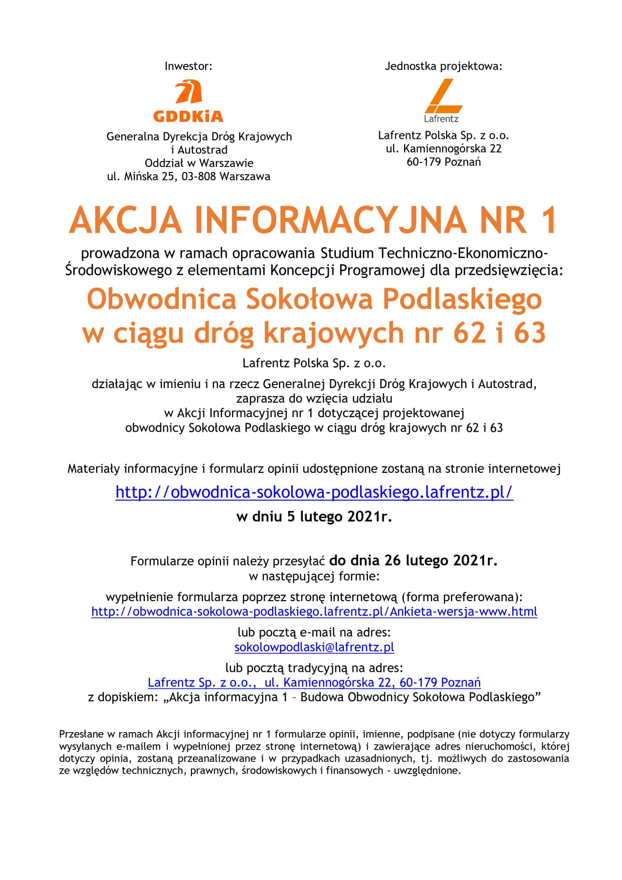 - pocztą tradycyjną na adres: Lafrentz Sp. z o.o., ul. Kamiennogórska 22, 60-179 Poznań, z dopiskiem: „Akcja informacyjna 1 – Budowa Obwodnicy Sokołowa Podlaskiego”.