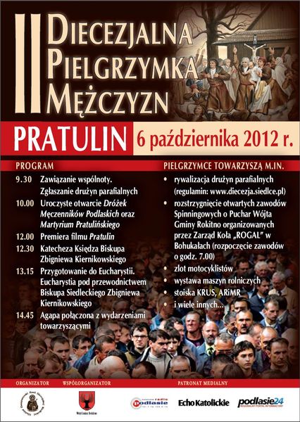 Zapraszając na pielgrzymkę na antenie Katolickiego Radia Podlasie, biskup siedlecki Zbigniew Kiernikowski, przyznał, że samo sanktuarium, choć nie jest łatwym w odbiorze ponieważ dotyczy męczeństwa, może być jednak wyzwaniem dla mężczyzn. Przyznał, że jego pragnieniem jest, aby w Pratulinie mężczyźni kształtowali swoje osobowości według wzorca i świadectwa prostych, wierzących, prostolinijnych błogosławionych unitów. Podkreślił że we współczesnych czasach ważne jest odkrycie własnej tożsamości i dzielenie się doświadczeniem przeżywania życia mężczyzny. Centralnym punktem programu pielgrzymki będzie Eucharystia pod przewodnictwem bpa Zbigniewa Kiernikowskiego.