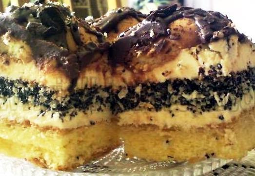 Upieczony biszkopt posmarować dżemem. Placek makowo kokosowy posmarować 1/3 masy i położyć masą na dżem. Na placku mak-kokos. wyłożyć resztę masy i układać ciasno nasączone w alkoholu biszkopty (np. w rumie).
