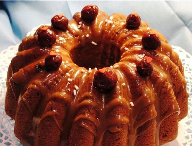 Żółtka utrzeć z masłem i cukrem. Powoli, dodawać po kilka kropli kawy, na przemian z mąką. Olej także wlewać małymi porcjami. Dobrze osączone wiśnie obtoczyć w mące (kilka odłożyć do dekoracji). Ubić pianę białek. Na ciasto wyłożyć wiśnie, ubitą pianę, wymieszać. Piec w temperaturze 180 stopni ok. 1 godzinę. Polewa: Kawę rozpuścić w małej ilości wody. Dodać do cukru pudru. Lukrować.