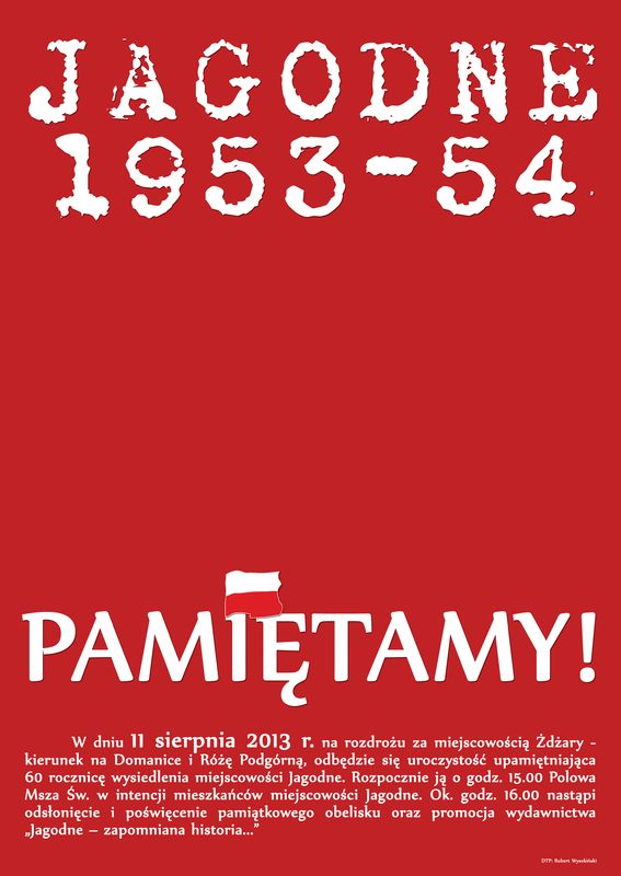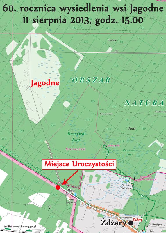 11 sierpnia na rozdrożu za miejscowością Żdzary, w kierunku na Domanice i Różę Podgórną, odbędzie się uroczystość upamiętniająca 60. rocznicę wysiedlenia mieszkańców wsi Jagodne. Rozpocznie ją polowa msza święta. Nabożeństwo odprawione zostanie o godzinie 15.00. Po mszy nastąpi odsłonięcie i poświęcenie pamiątkowego obelisku oraz promocja wydawnictwa „Jagodne – zapomniana historia...”. Autorem publikacji jest Krzysztof Fornal.