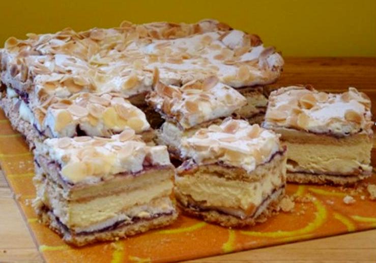 Formę o wymiarach 25 x 33 cm wyłożyć papierem do pieczenia. Jedną część ciasta wyłożyć na spód, rozwałkować i wyrównać. Na nim posmarować połowę dżemu z czarnej porzeczki. Następnie wyłożyć połowę masy bezowej. Na masę bezową wysypać połowę płatków migdałowych. Piec w temperaturze 175ºC przez około 40 minut. Identycznie postąpić z drugą częścią ciasta. Można obydwa placki piec razem w piekarniku (z termoobiegiem) lub jeden po drugim (jeśli nie mamy dwóch takich samych form); wtedy najlepiej drugą bezę przygotować bezpośrednio przed pieczeniem. Placki ostudzić.