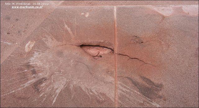 Widać znaczne ślady zniszczeń, liczne dziury, zacieki, pęknięcia. Niespełna rocznemu pomnikowi będzie potrzebna renowacja.