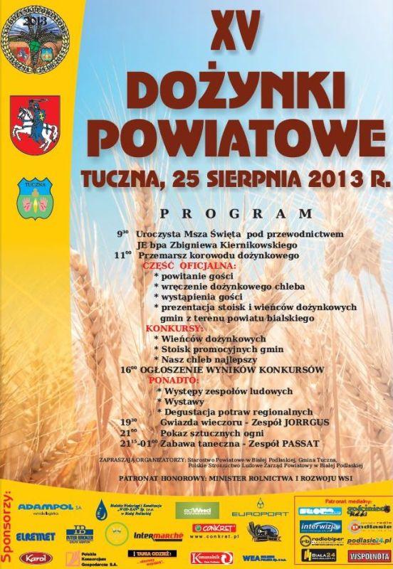 XV Dożynki Powiatu BialskiegoBialskie Starostwo Powiatowe, gmina Tuczna, Zarząd Powiatowy Polskiego Stronnictwa Ludowego w Białej Podlaskiej zapraszają na XV dożynki powiatu bialskiego. Święto Plonów odbędzie się w niedzielę 25 sierpnia w Tucznej.