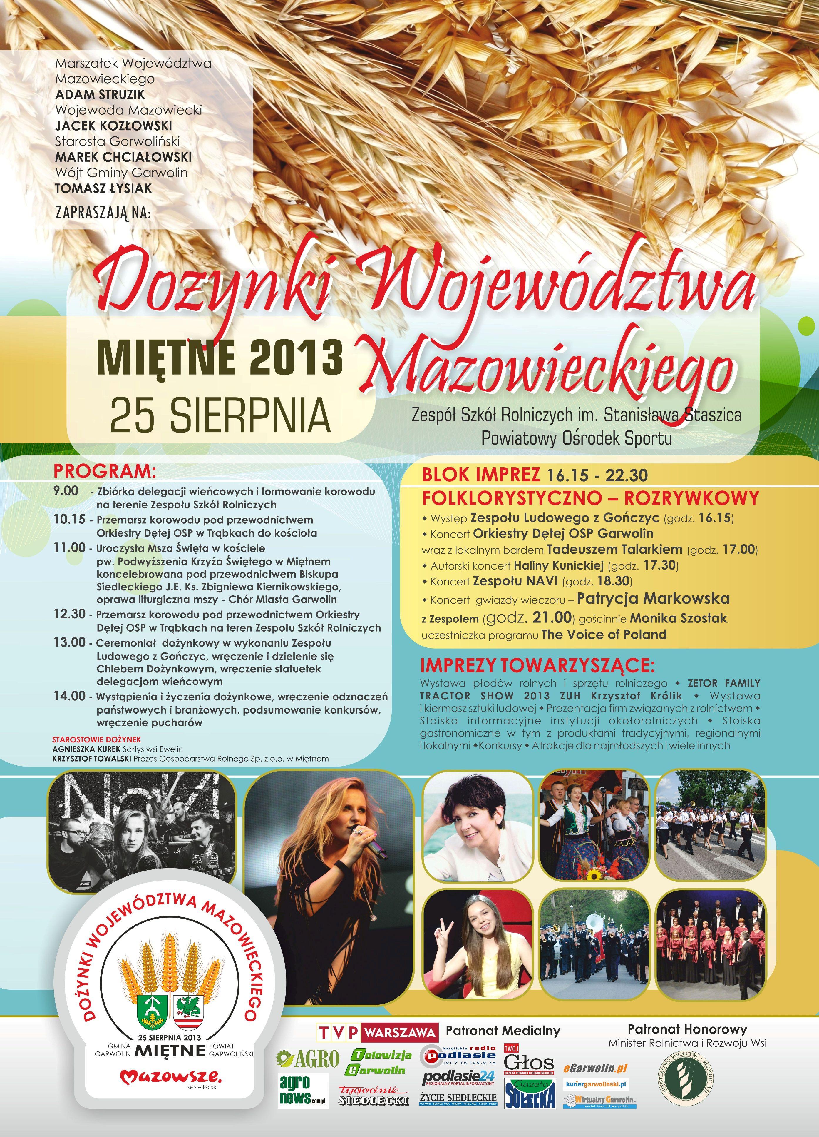 XV Dożynki Województwa Mazowieckiego w MiętnemJuż w niedzielę, 25 sierpnia odbędzie się największe na Mazowszu święto rolników – Dożynki Województwa Mazowieckiego. W tym roku uroczystości związane z zakończeniem żniw będą miały miejsce w Miętnem.