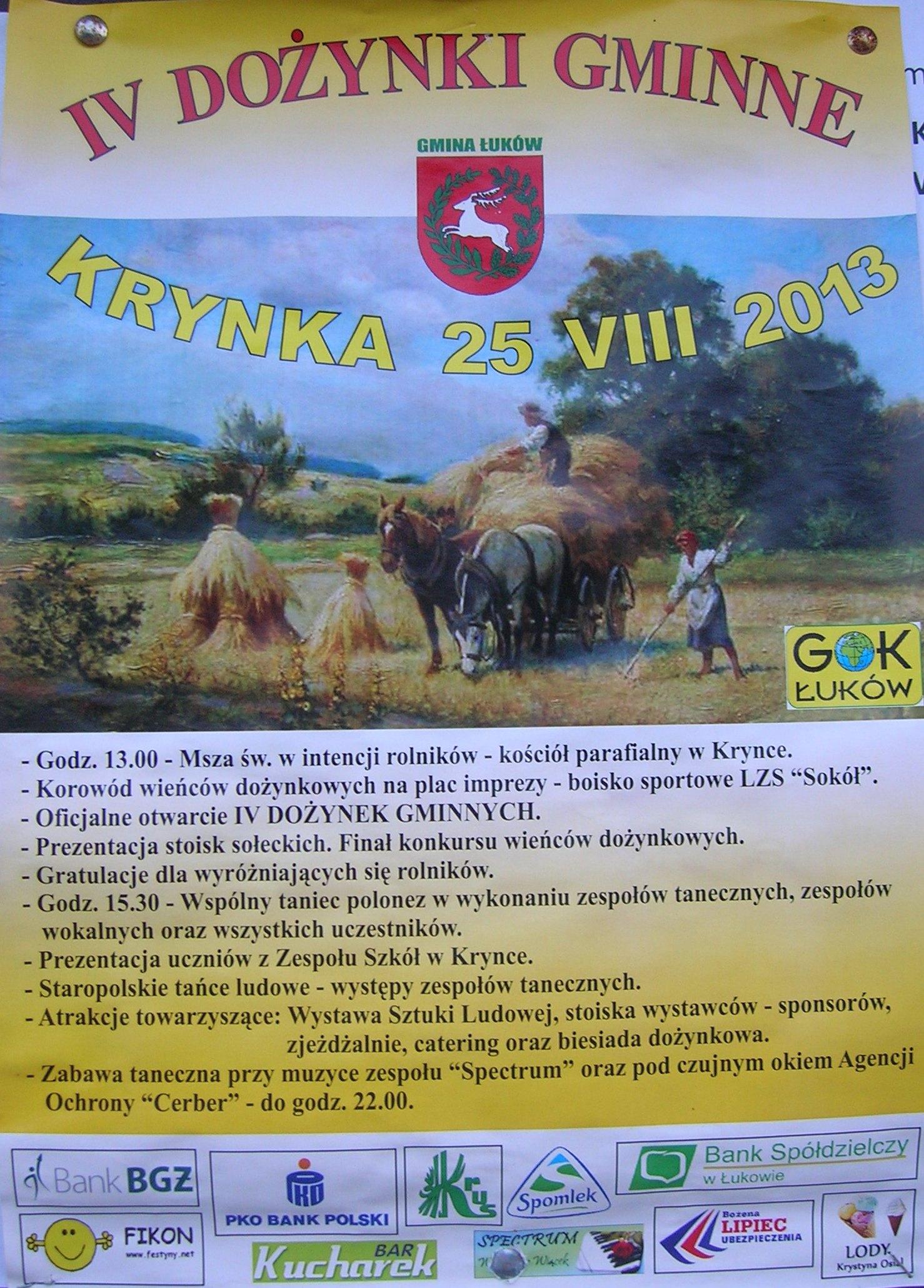 Dożynki w gminie Łuków25 sierpnia w Krynce odbędą się IV Dożynki Gminne. Corocznie uroczystość ta ma miejsce w innej wsi będącej siedzibą parafii.
