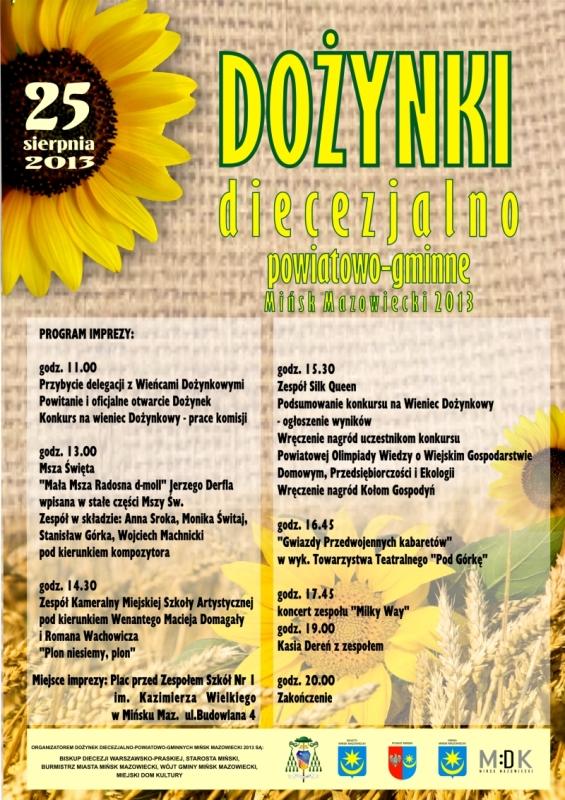 Dożynki w Mińsku Mazowieckim25 sierpnia 2013 roku na placu przy Zespole Szkół im. Kazimierza Wielkiego w Mińsku Mazowieckim, ul. Budowlana 2 odbędą się Dożynki Diecezjalno - Powiatowo - Gminne.