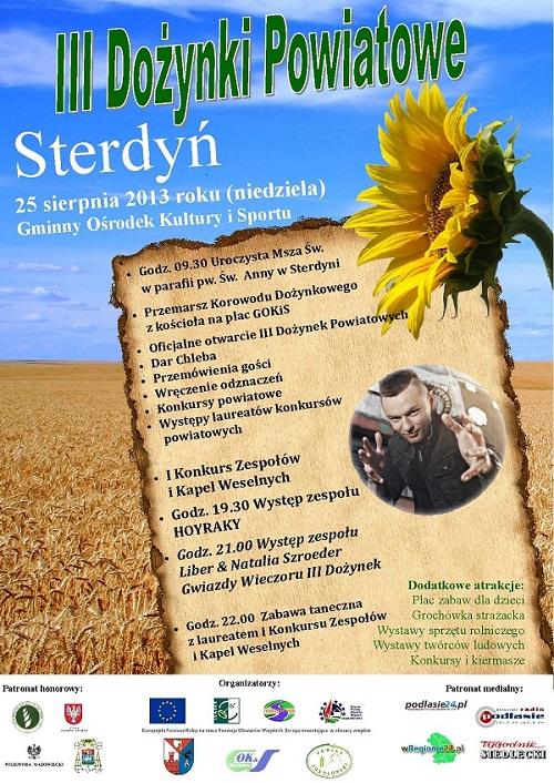 Dożynki Powiatowe w SterdyniTegoroczne Dożynki organizowane na terenie powiatu sokołowskiego odbędą się w najbliższą niedzielę, 25 sierpnia na terenie Gminnego Ośrodka Kultury w Sterdyni.
