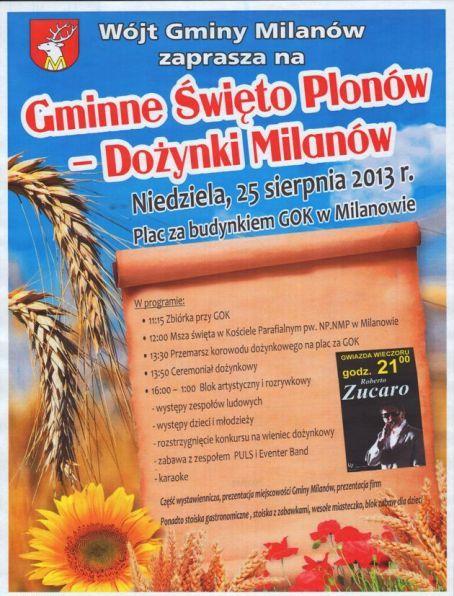 Dożynki Gminno-Parafialne w MilanowieW niedzielę, 25 sierpnia w Milanowie odbędą się Dożynki Gminno-Parafialne.