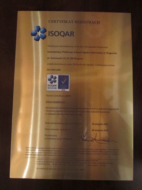 Certyfikat dyrektorowi Arturowi Skórze wręczyli: Fryderyk Zalewski z firmy konsultingowej, która wdrażała system ISO 9001 w SP ZOZ i Paweł Dąbrowski z firmy certyfikującej (Dyrektor Zarządzający jednostki certyfikującej ISOQAR), obecni na sesji. Przygotowania do wdrożenia projektu w szpitalu w Węgrowie trwały rok. Certyfikat został przyznany na okres 3 lat, jednak raz na 12 miesięcy w firmie odbywać będzie się audyt, mający na celu sprawdzenie czy wszystko przebiega zgodnie z normami.