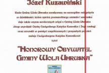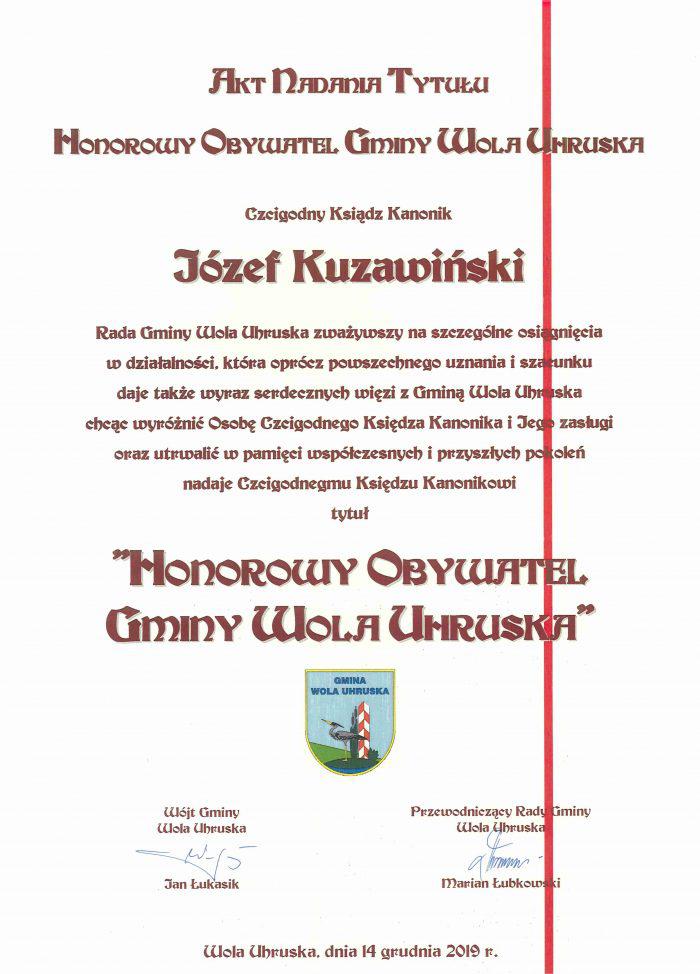 14 grudnia 2019 roku w trakcie uroczystej sesji Rady Gminy Wola Uhruska ks. kan. Józef Kuzawiński otrzymał od gminnego samorządu zaszczytny tytuł Honorowego Obywatela.Uroczystości rozpoczęły się Mszą św., po której w auli Zespołu Szkół odbyła się sesja rady gminy. W trakcie obrad 15 radnych jednogłośnie zagłosowało za wnioskiem o nadanie tytułu proboszczowi. Obradom przysłuchiwali się wierni z rady parafialnej, przedstawiciele organizacji pozarządowych oraz sołtysi. Wniosek o nadanie tytułu podpisało 626 mieszkańców Woli Uhruskiej. W uzasadnieniu napisano: „obecność duszpasterza w miejscowości wywarła pozytywny wpływ nie tylko na całą społeczność lokalną, ale również na poprawę estetyki infrastruktury sakralnej w gminie. Dzięki wzorowej współpracy z radą parafialną proboszcz dokonał długo oczekiwanych remontów i doposażenia kaplic wiejskich w Zbereżu, Stulnie i Mszance. Dopomógł w wymianie ogrodzenia kaplicy w Bytyniu i renowacji tamtejszego przydrożnego krzyża. Poza tym ksiądz jest wzorem lokalnego patrioty. Nie było takiego wydarzenia, w którym by nie uczestniczył lub którego by nie współorganizował..."- napisano. WIĘCEJ