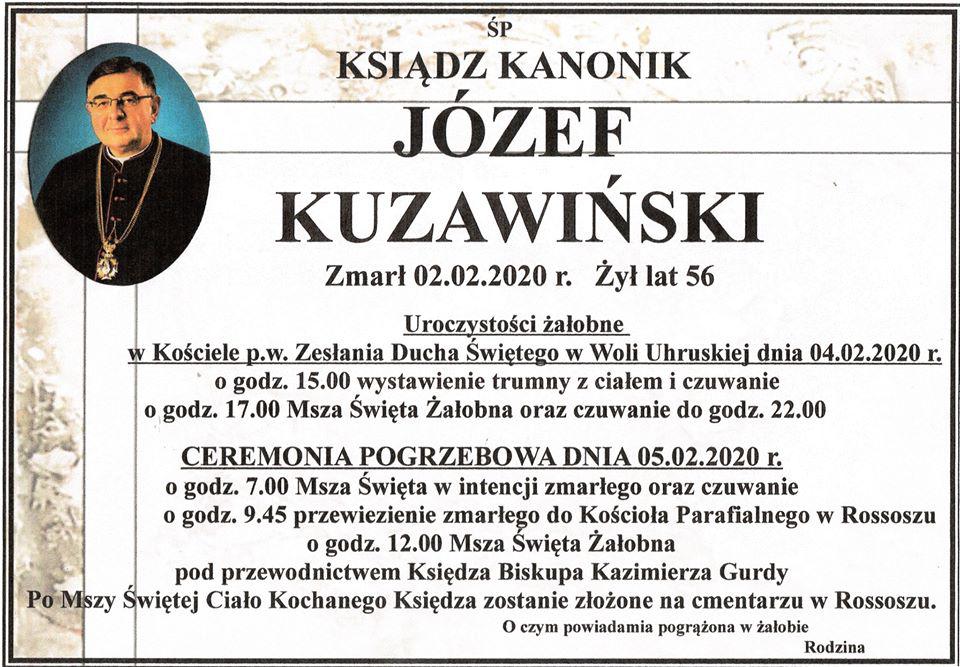 Ks. kan. Józef Kuzawiński urodził się 18 marca 1963 roku w Warszawie w rodzinie o głębokich tradycjach religijnych i patriotycznych. Ukończył LO im I. Kraszewskiego w Białej Podlaskiej. W 1981 roku wstąpił do WSD w Siedlcach. Święcenia kapłańskie przyjął 11 czerwca 1988 roku z rąk Księdza Biskupa Jana Mazura, ówczesnego biskupa siedleckiego.Po święceniach podjął pracę duszpasterską w parafii pw. Podwyższenia Krzyża Św. w Łaskarzewie, następnie w parafii pw. św. Józefa w Siedlcach i w parafii Matki Bożej Nieustającej Pomocy w Radzyniu Podlaskim. Po 10-letniej posłudze kapłańskiej wyjechał na Ukrainę do Seminarium Duchownego w Gródku Podolskim. Tam oraz w Instytucie Nauk Religijnych prowadził wykłady z teologii fundamentalnej i moralnej. Sprawował też opiekę nad alumnami tzw. roku wstępnego. Podjął się także opieki nad Domem Prowincjalnym Sióstr Sercanek Najczystszego Serca NMP. Oceniany był jako doskonały wykładowca i wychowawca oraz świetny organizator. Po 5 - letnim pobycie na Ukrainie w 2002 roku kapłan powrócił do Polski. Tu, decyzja ówczesnego Biskupa Siedleckiego Zbigniewa Kiernikowskiego, objął stanowisko proboszcza parafii pw. Św. Stanisława Biskupa i Męczennika w Wereszczynie. Posługiwał tam 10 lat. W listopadzie 2012 roku objął funkcję proboszcza parafii pw. Zesłania Ducha Świętego w Woli Uhruskiej.